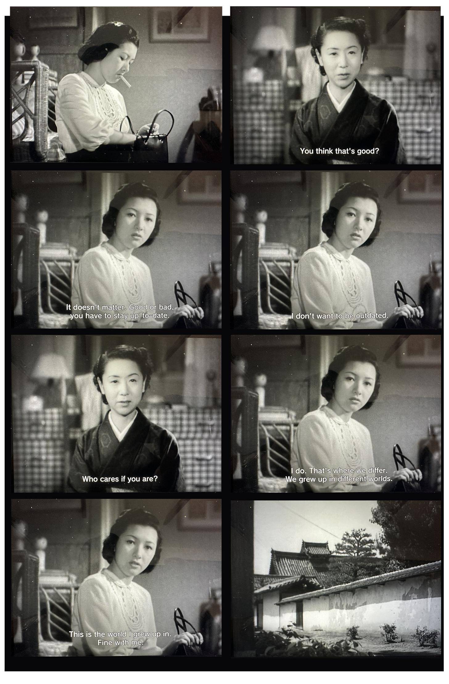Sometimes storm clouds gather above my big beautiful brain and with a sudden jolt it strikes me that — try as I might to delude myself through elaborate intellectual justifications, and despite co-creating a brilliant newsletter devoted to the principle that cool clothes rock — fashion is dumb and my investment in it is a sickness. The other night was one of those times. We watched a Criterion interview with swag lord and cinematic king Wim Wenders where he shouted out a 1950 feature by Yasujirō Ozu — a major hero in the Spyplane Cinematic Pantheon — called Munekata Sisters. We hadn’t ever seen it, so we threw it on.