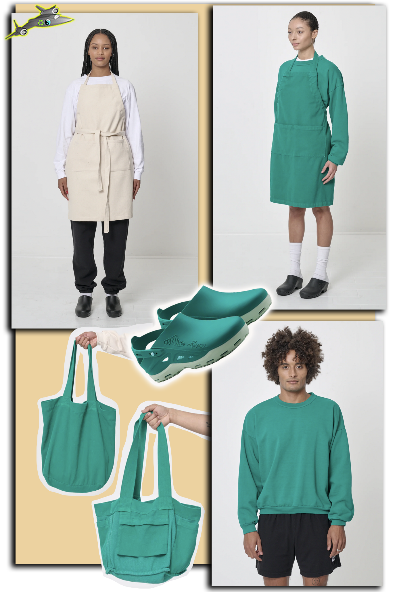 - A sick apron, plus a clutch of sick tees, sweatshirts, shorts & totes in a beautifully un-basic shade of green