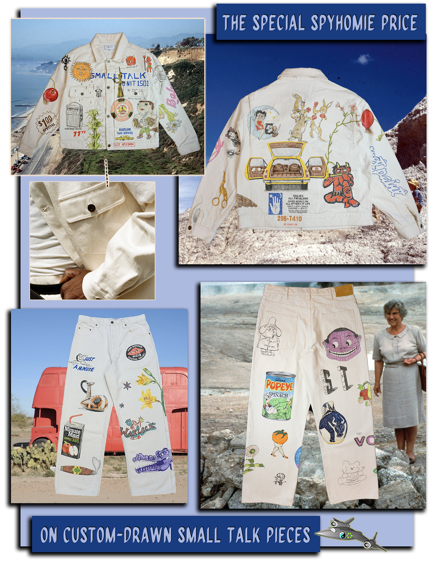 Spyfriends Nick and Phil from NYC’s Small Talk Studio recently dropped their second-ever collection of cut-and-sew pieces, which rip, but real ones know they first made their name on the strength of their custom-drawn pieces — much-imitated, never-equaled — where the STS crew festoon a garment with motifs personal to you. (We first wrote about Small Talk in Spyplane Year One. You can see the jacket I ordered from Nick in that sletter.)