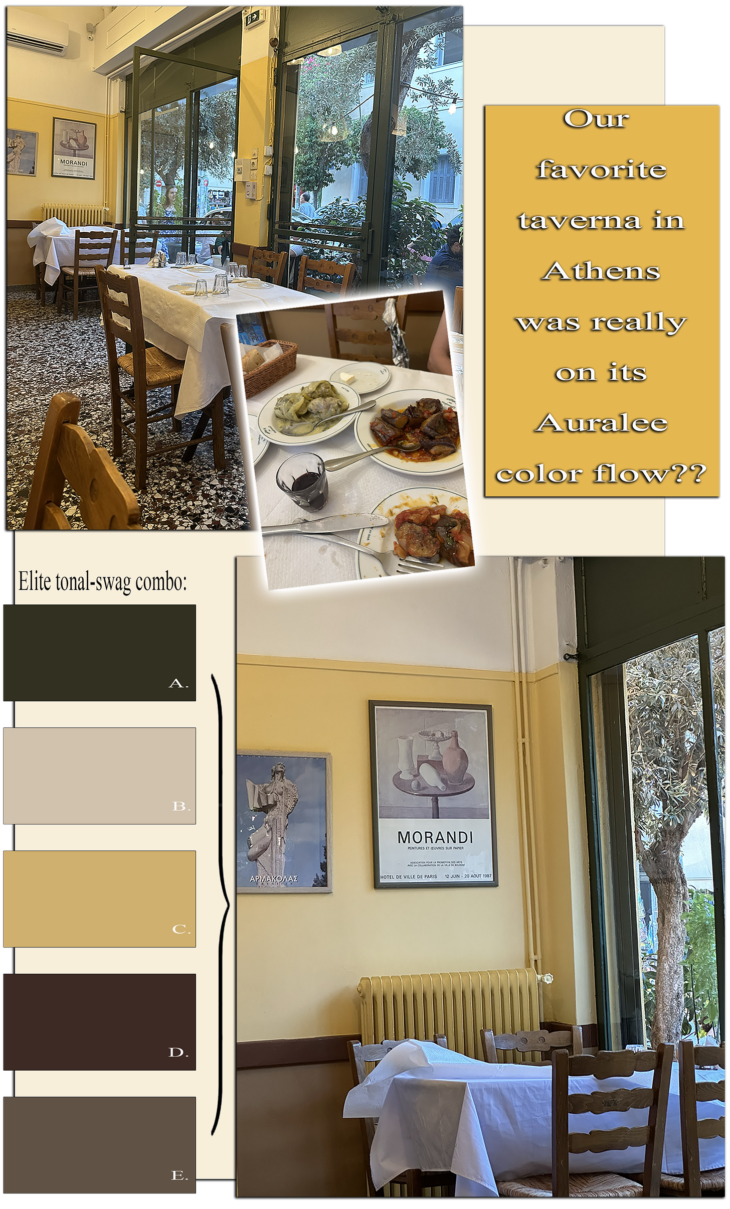 Specifically, we’re trying to channel its sublime interior color scheme, which embodies the color-combining technique we call “Tonal Swag.” This place is tonal-swagged-out to an elite degree that would fit right in on an Auralee or Casey Casey moodboard. Yes, the print by still-life master Giorgio Morandi is lovely and tonally swaggy in its own right. But the true achievement is the exquisite 5-color symphony happening on the walls, as diagrammed above.