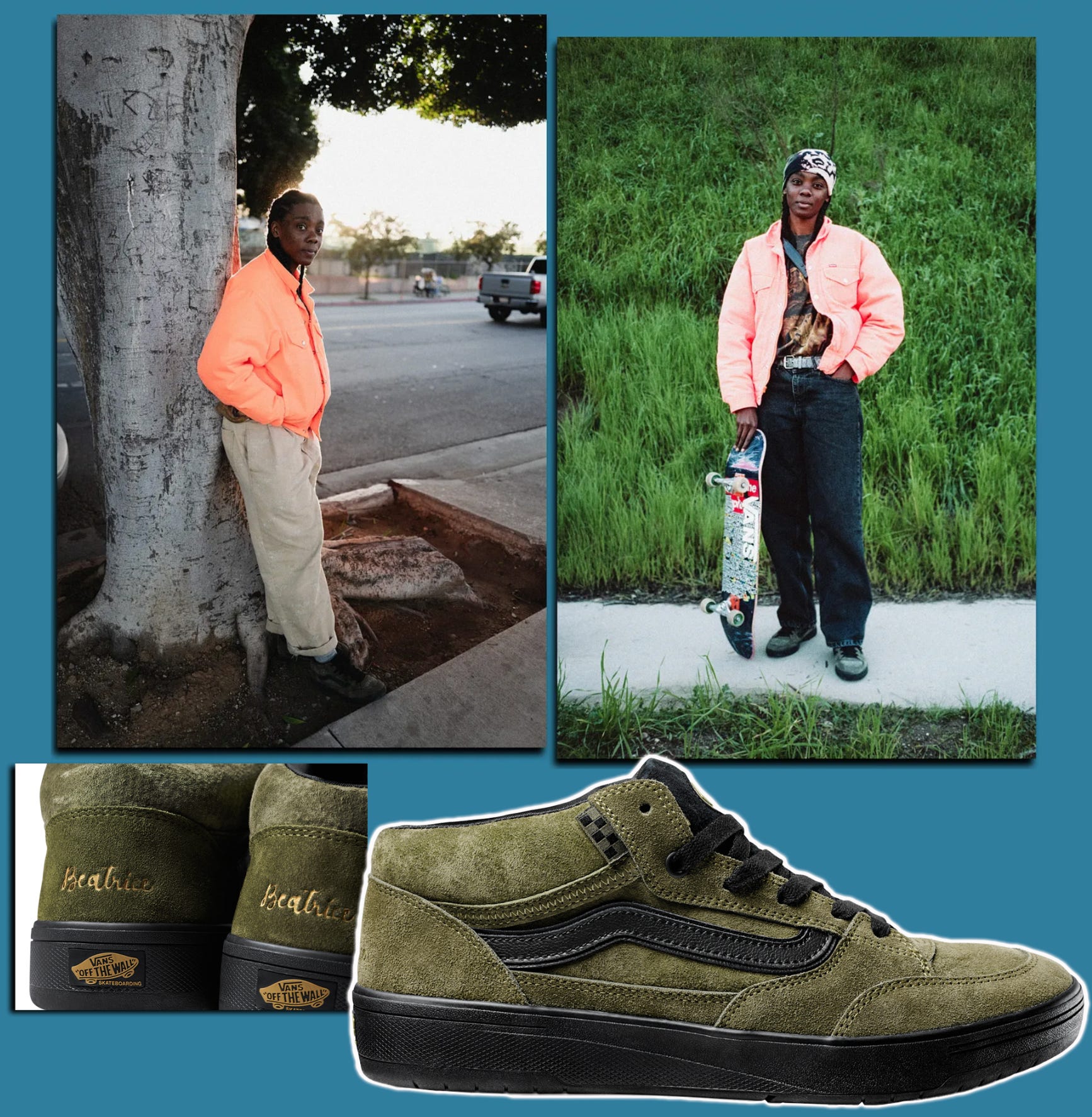 And in a World Spyplane Exclusive we can reveal that next week — on July 13 to be exact — Vans is putting out 2 cool shoes they whipped up with Beatrice: a Skate Style 53 penny loafer and a new silhouette called the Zahba Mid by Beatrice Domond. Both are nubuck, in an earthy hue inspired by “this tree I saw walking around New York while the seasons were changing, and it was half-green, half-brown,” Beatrice explained.