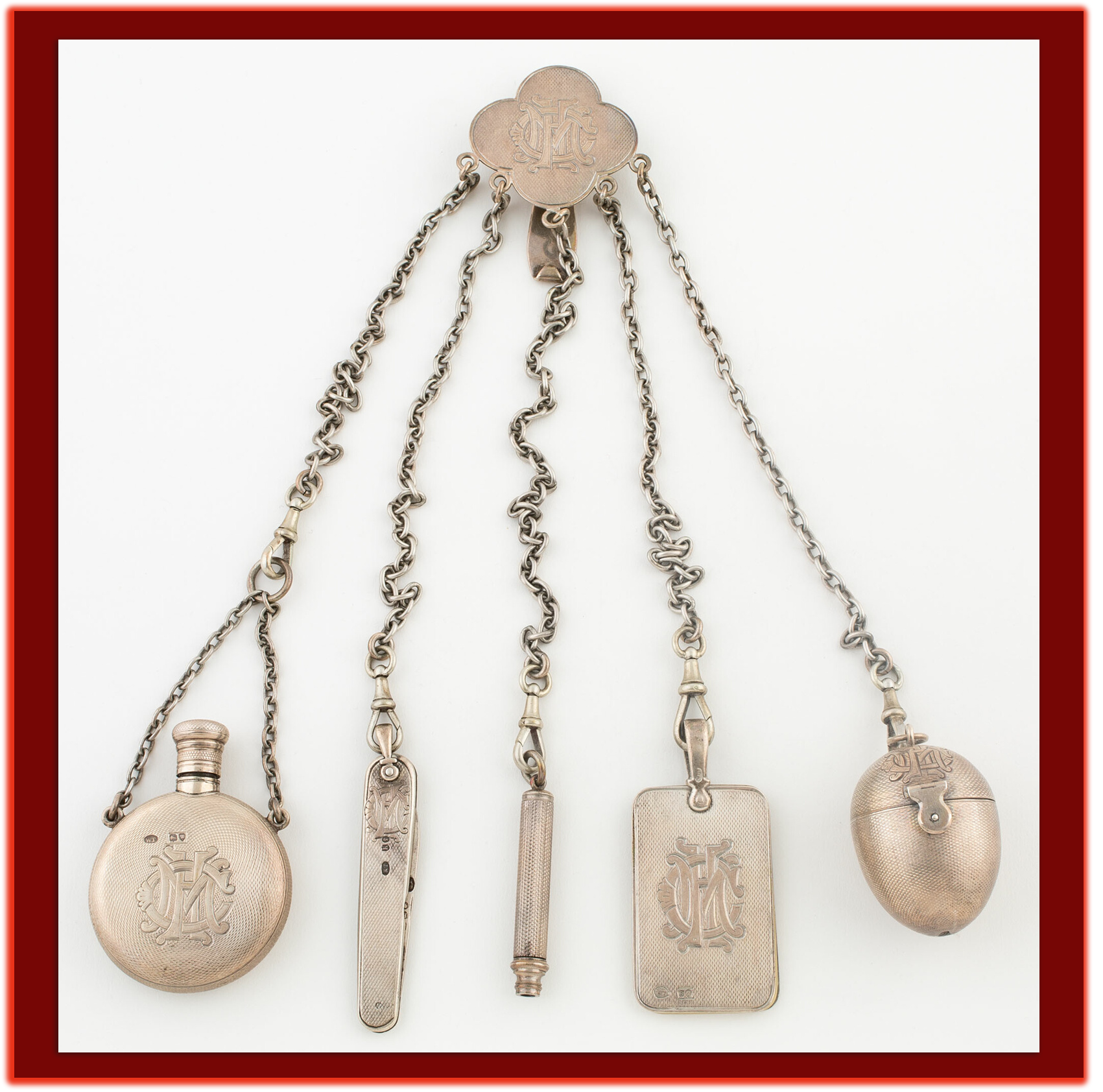 Wearing functional objects has its roots in Victorian chatelaines, which were basically clip-on keyrings with chains attached (pictured below). Back then, women’s clothing didn’t have pockets, so they’d hook things they might need during the course of a day — a perfume vial, notepad, watch, scissors, etc. — to the chatelaine, and secure it to the waist of their skirts…