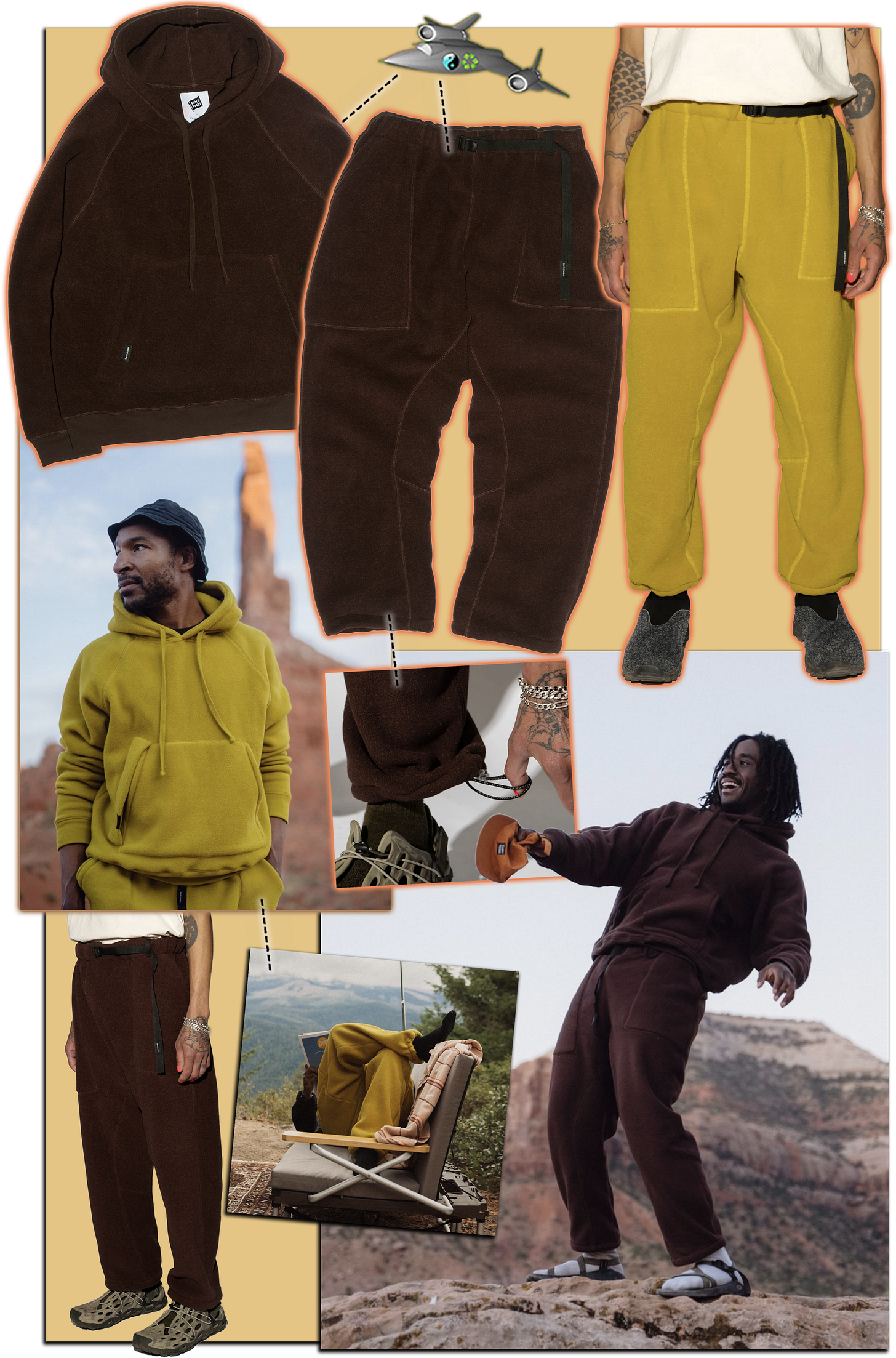 For this collab, Earth\Studies “created a limited edition of our ESCEP insulation system”: A set of oversize fleece hoodies and fleece pants (the latter of which happen to be modeled on the same sick trail joints I’ve been rocking) in rich “fig” and “turmeric” hues. These are made in L.A. from 85% recycled Polartec 200, and you’ll find a typically thoughtful Earth/Studies SMATTERING of bungee cords, adjuster toggles, mesh pockets, snap closures and self-belts across the pieces…