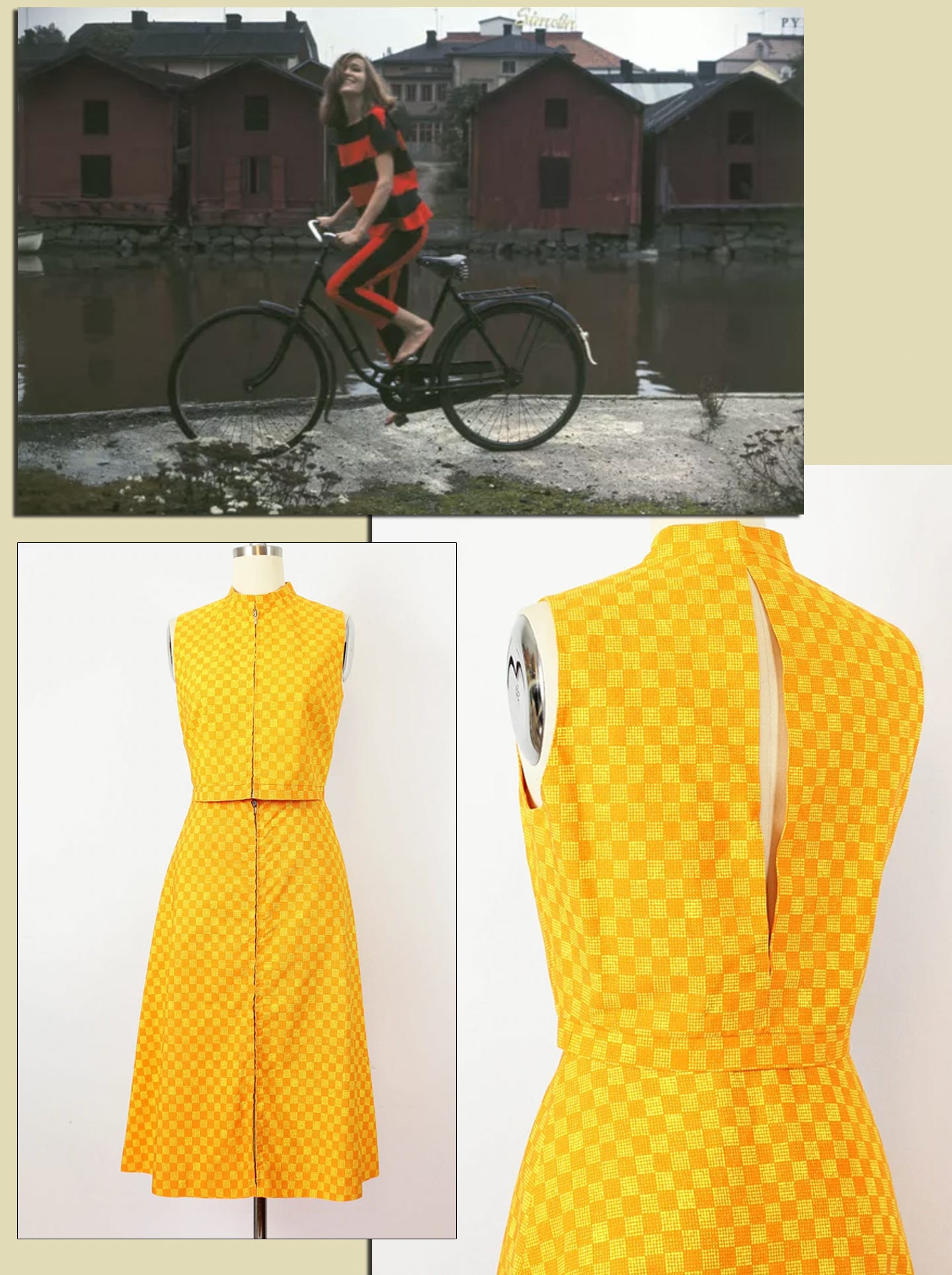 In the ‘60s, miniskirt and petal-pusher-pants combos were the wave. The amazing 1969 yellow-checker Marimekko set above should be in some climate-controlled vault next to the McCardell pieces but, instead, it could live in your closet, because someone’s selling it here.