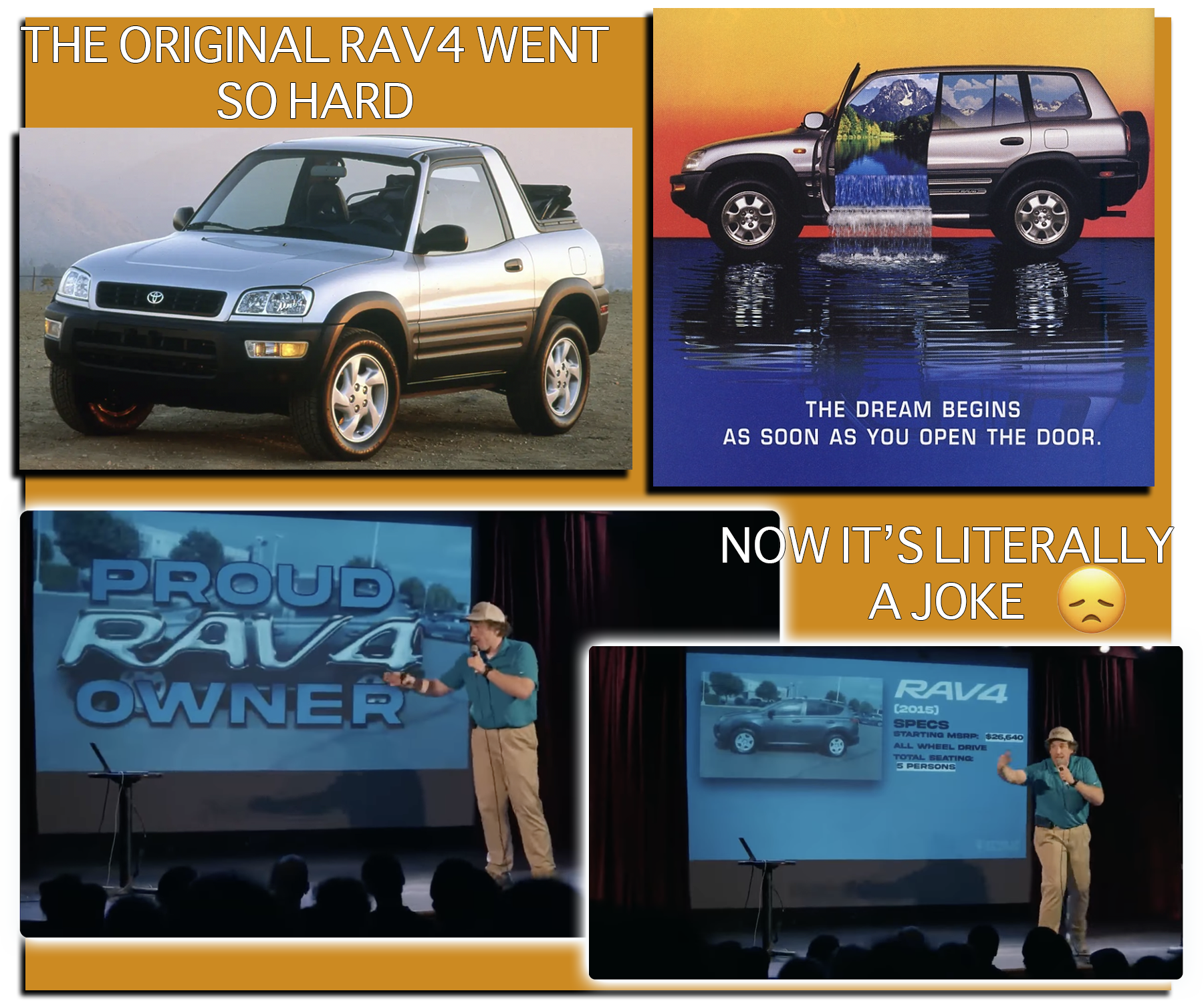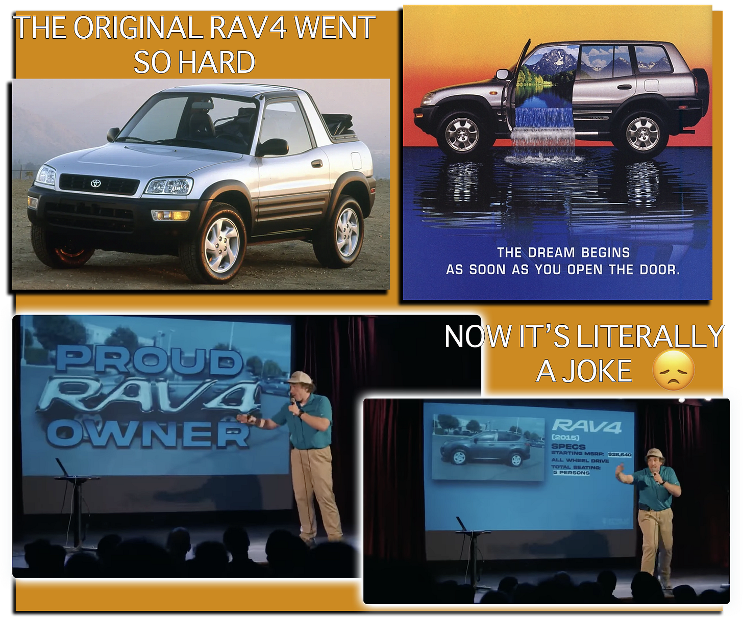 Blackbird Spyplane: There’s an extended bit about how much your character loves the Toyota RAV4. We love the RAV4 at Blackbird Spyplane, too, but only the early ones (above top row), which were so strange and cool-looking. Almost like an anime vehicle in real life. The OG two-door RAV4 feels emblematic of this moment when the American automotive market could still accommodate cars that tight. Whereas the newer RAV4s are not swag. They could be any SUV.