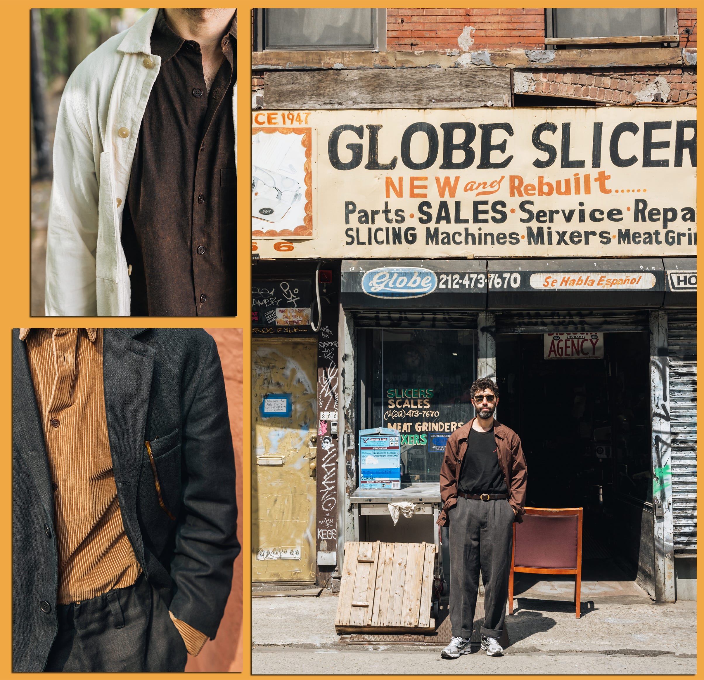 Secondly, I (Jonah) did an interview a month ago in NYC that just dropped with Chris Fenimore at Esquire. We chopped it up about profound matters, and I wore some profound clothes that he flicked up LOVINGLY — the man knows how to photograph fabrics ! — for his “Five Fits With” Column.