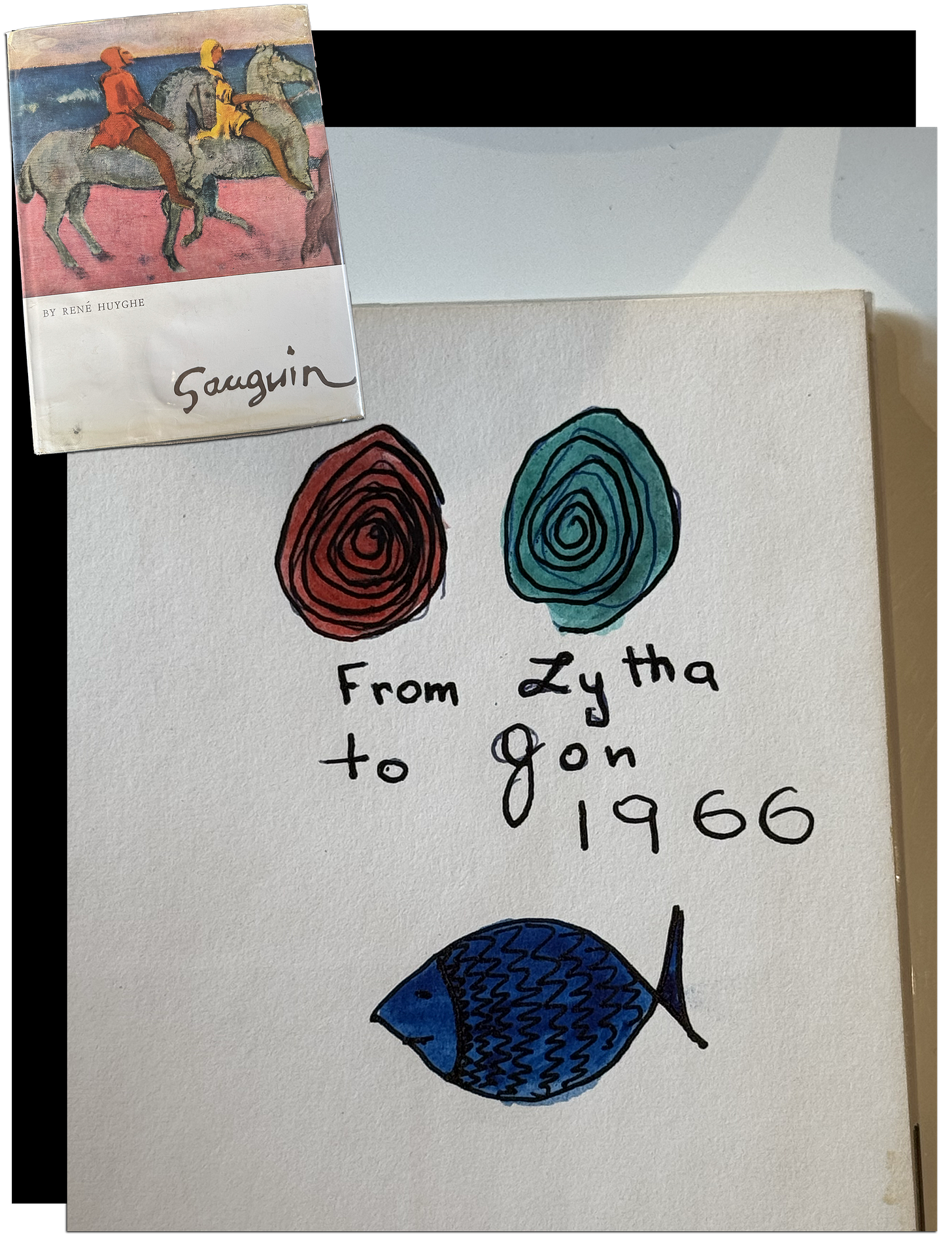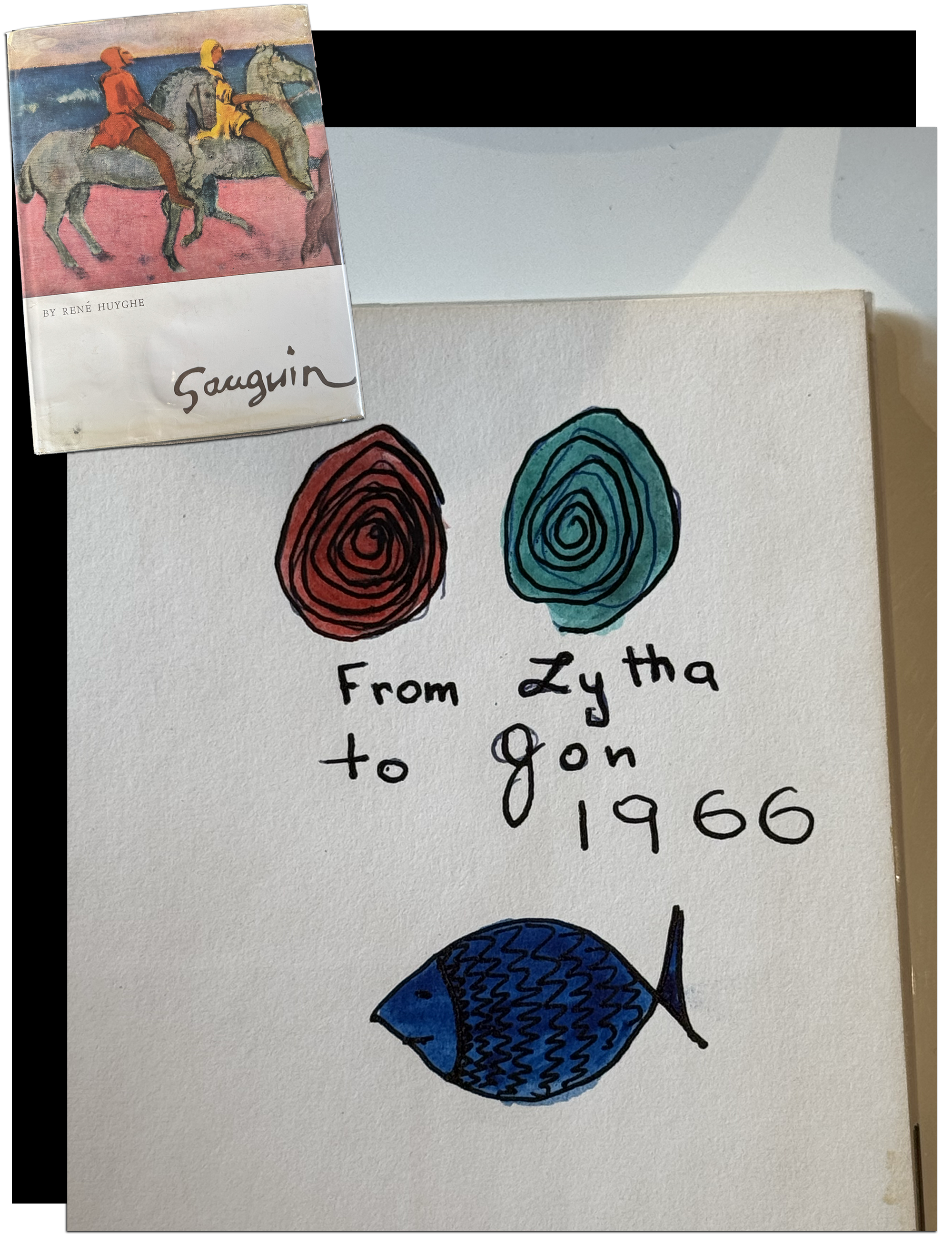 Book inscriptions are similarly wonderful to receive, and wonderful to stumble across, too, as a third party. Look at this fantastic illustrated inscription from 1966 that Erin found on the flyleaf of a secondhand Gauguin book she recently yopped for peanuts at a flea market:
