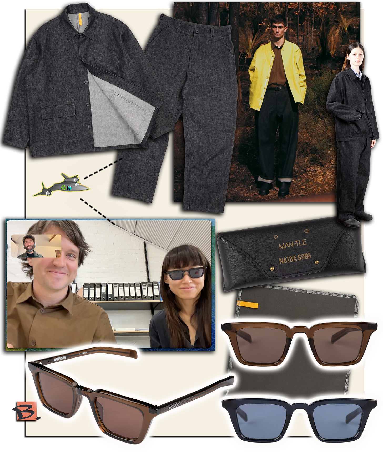 Also new this season? “Our first piece of eyewear.” The E1 sunglasses, silhouetted above, are a collaboration with Tommy Ogara of Japan’s revered Native Sons: A revival, in two Man-tle-devised colorways, of a decommissioned frame called the Cooper, which “Tommy describes as a ‘slash across the face,’” says Larz. For Native Sons’s HQ, Ogara took over a former primary school in Sabae, Fukui, and “retrofitted it with all this beautiful machinery. He makes everything there, with full control over the entire process. No one’s working the way Tommy does.”
