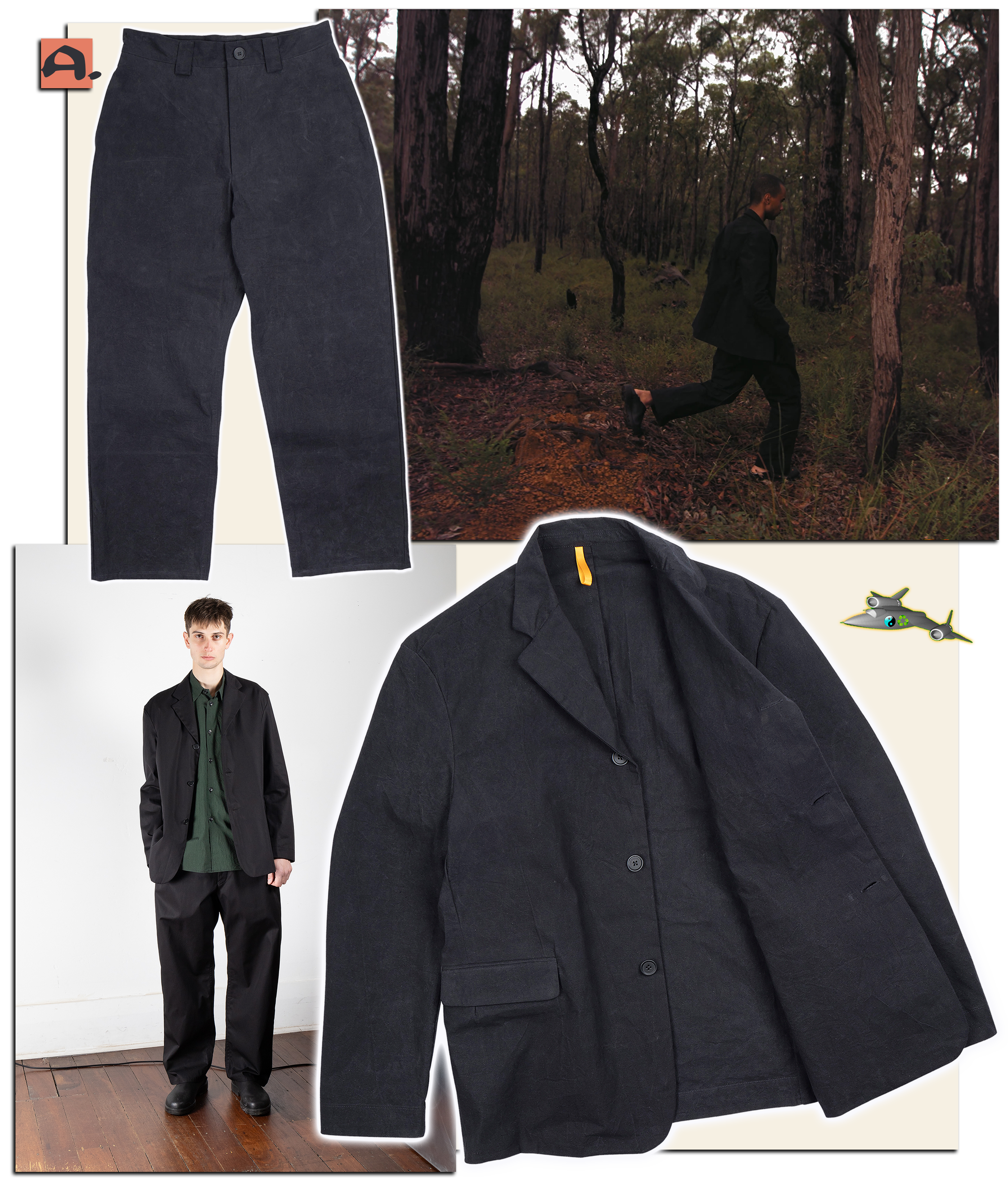 The suit comes in one of two fabrics: black waxed-cotton, and a softer cotton gabardine with a water-resistant “Aqua Magic coating — we call it Black Magic,” Larz explains. “It’s quite a light fabric for us, 280g or something.” (Departamento in L.A. is getting an exclusive yellow waxed-cotton version, FYI.)