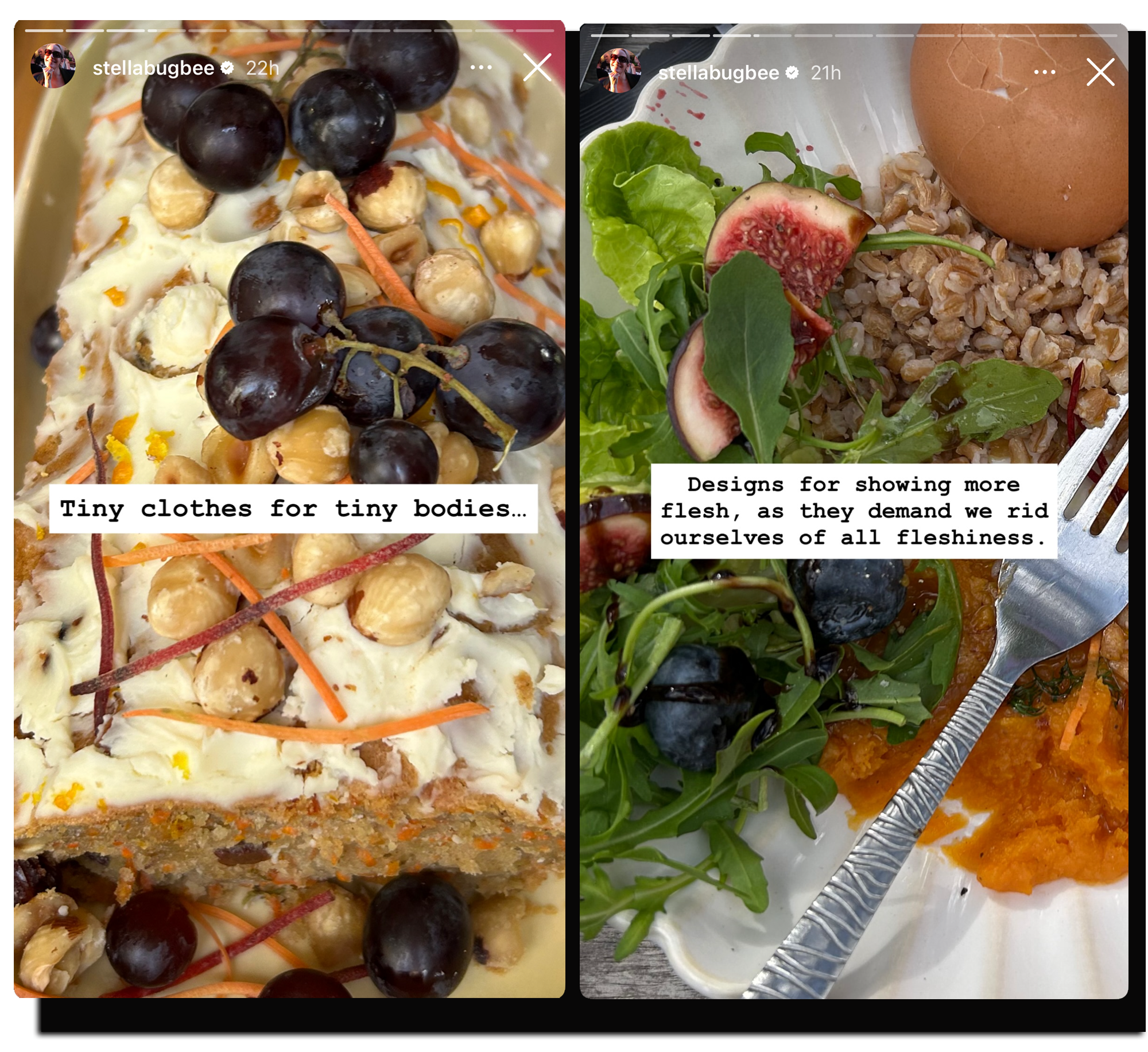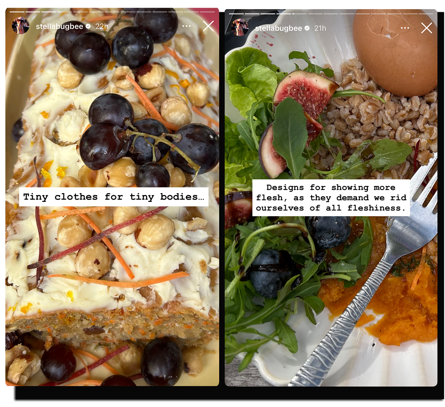 Concorde: The fashion industry has always preyed on people’s insecurities, and its visions for women’s bodies haven’t always been something you could call liberatory. This came up in a conversation I had the other day with the author of a biography about Claire McCardell, who designed clothes with ease for working women in the 1940s, that were very distinct from the corseted suits Christian Dior was designing around the same time. So was this basically more of the same, or is there something distinctly new you feel brewing? After you posted those stories, you mentioned that they got a lot of attention — they clearly resonated with people right now.