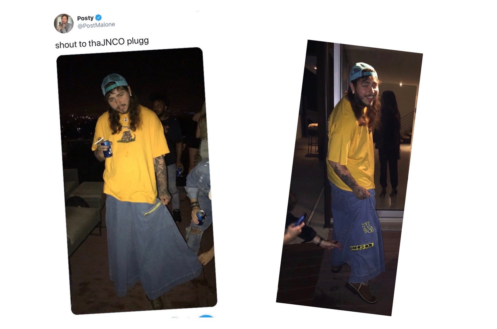 But truth is, the topic of how pants should fit has vexed me since adolescence… Please trust & believe that circa ‘96 the kid’s trousers were ILL-ADVISEDLY VOLUMINOUS … copping ultra-wide-leg pants, my friends & I chased an ego-death-like condition known as “total shoe engulfment,” i.e. leg-openings vast enough to ingest an entire sneaker like a damn JNCO anaconda … we looked a lot like this 2017 pic from MELODIC MASTER / STYLISH SCUMLORD Post Malone, except he comes off pretty chill whereas we def looked wack as f**k…