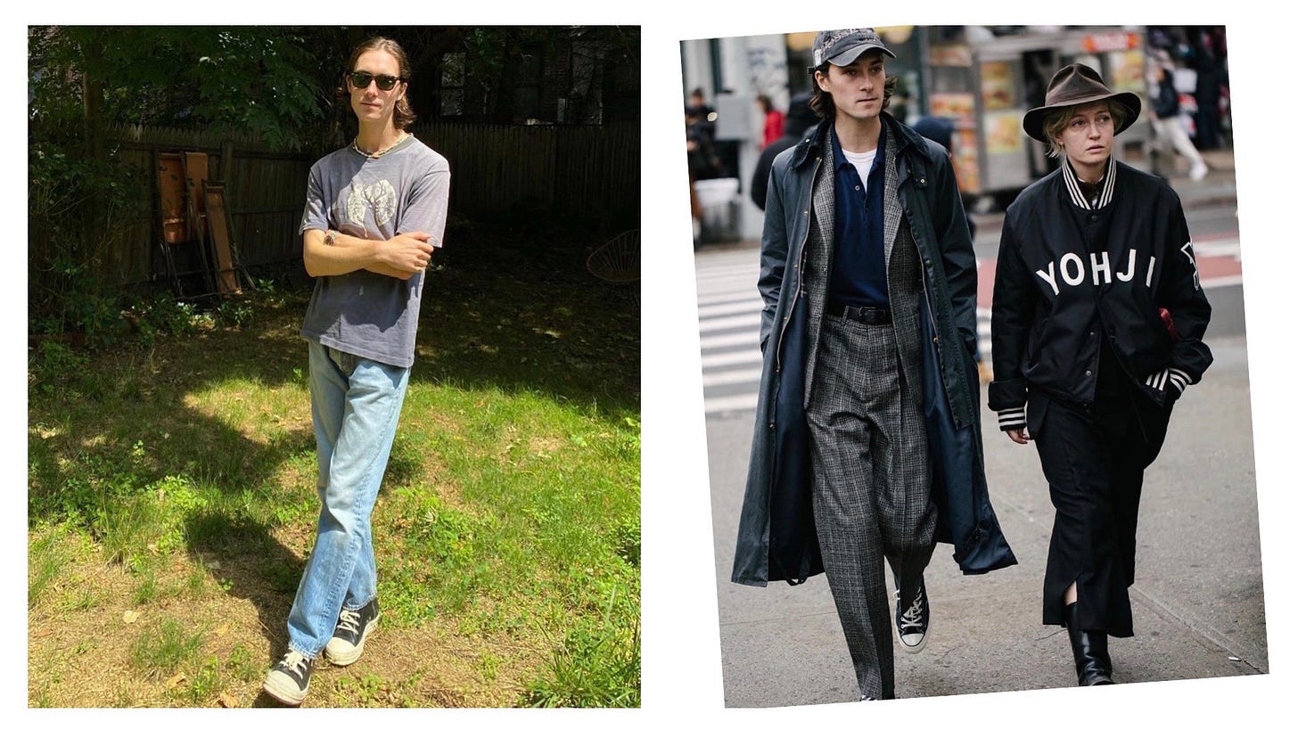 GQ Senior Associate Editor / walking Elizabeth Peyton painting Sam Hine has a fine-tuned sense for volume, which it turns out he calibrates to the most iconic garment in American Pantsdom: “Pants should fit like beat-to-hell vintage 501s!” Sam said. “It’s all about a medium rise, straight-but-slouchy fit, and structured fabric. That’s the key to nailing the golden ratio of pants, i.e. pants you can wear with loafers or Chelseas or” — as he’s rocking in the ‘90s-ed-out pic above-left — “Rick Owens Ramones.”
