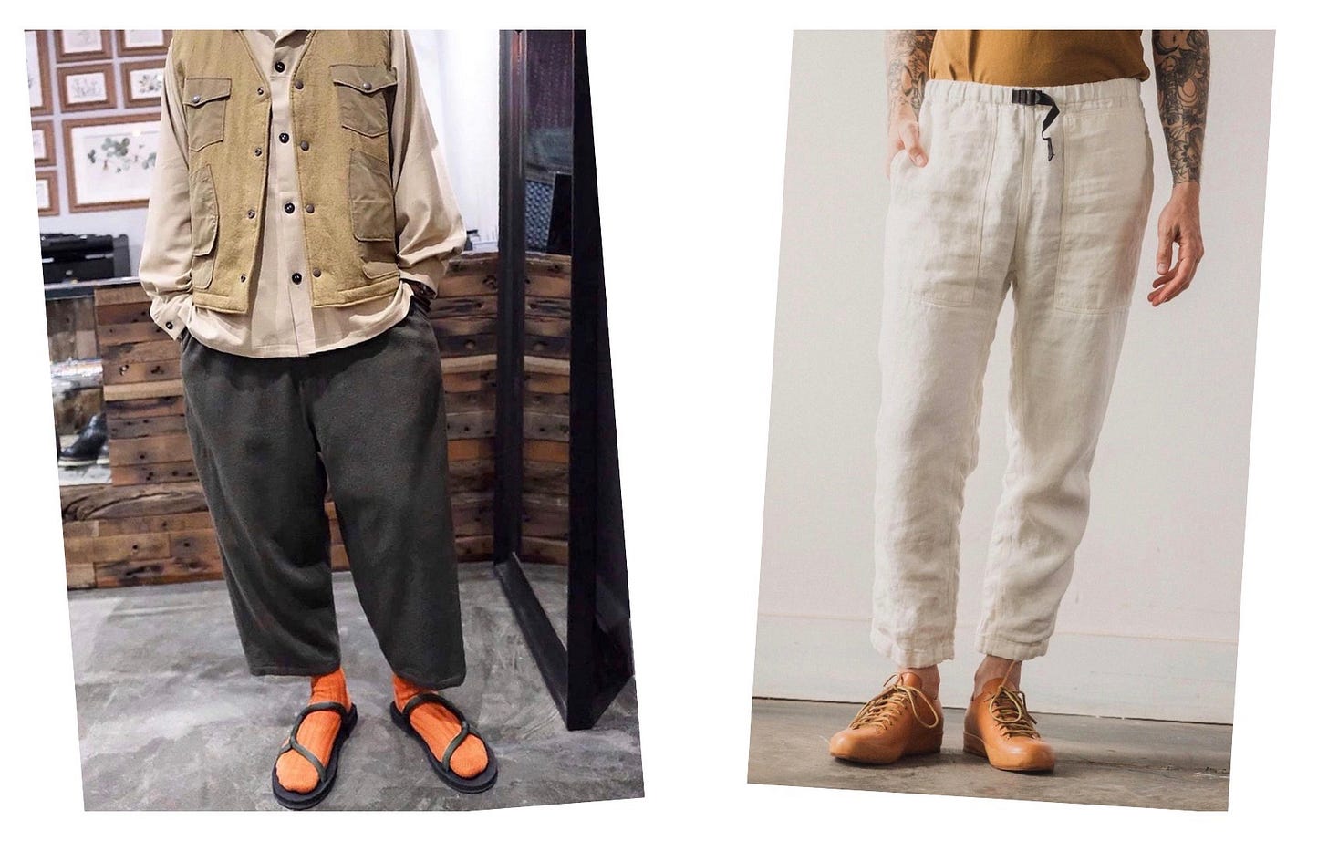orSlow’s lightly tapered “Climbing Pants,” above right, r a solid haute-GORP option, and since they’re cropped they don’t need a cuff to create a harmonious Footwear-Ankle-Pant (F.A.P.) interface…