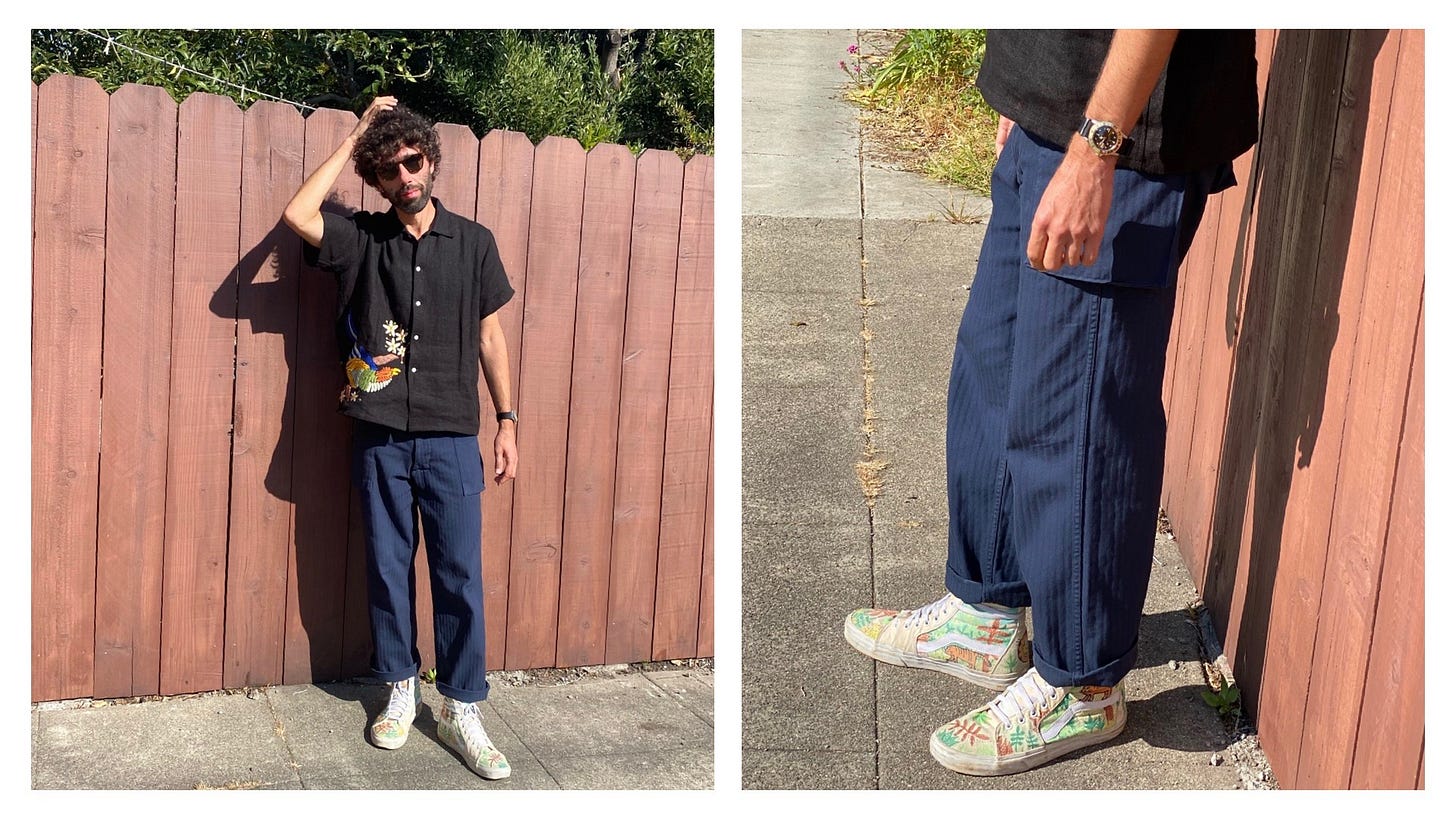 Osaka-based Bandanna Almanac mastermind / discerning ex-Kapital jawnsman Jonathan Lukacek was clinical: “Pants should fit so that when you sit, stand, ride, or crawl they do not constrict movement.” And Throwing Fits’ James Harris banged off a quick but comprehensive pants-fit rulebook: “Loose but not baggy, no e-boy cropped s**t, sitting at the hips, some break but no stacks or pooling, unless ur in some sleek loafers, then no break.”