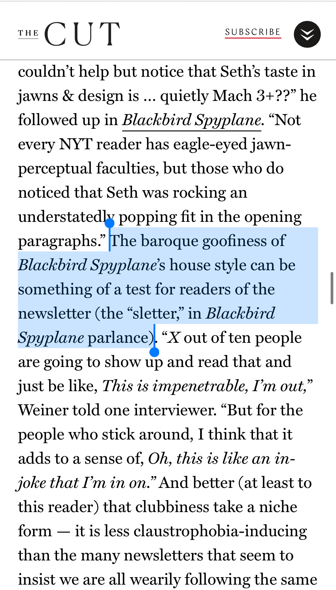 Hello!! First off peace to Molly Fischer at New York for citing us in her big newsletters piece yesterday — she kindly used Blackbird Spyplane to illustrate the pinnacle of what sletter-creation can be, not to mention the pinnacle of beautiful & blessed newsletter readerships, too, since by definition if U pass what she describes as our “baroque goofiness” test, you are certified “cool as h*ll” :