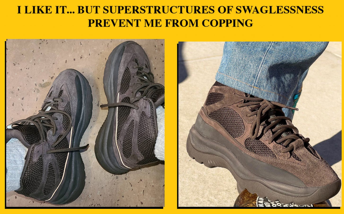Case in point: I appreciate the design of a few Yeezy sneakers in theory, but I own zero pairs. Only 1 model has ever spoken to me to the degree I actually considered copping — the Desert Boot — but the hypebeast frenzy around Yeezy jawnz has always been a roadblock for me: the cultural association between these clothes & shoes and craven raffle-enterers / St*ckX-bidders / sneakerhead herds / etc. is too strong & indelible for me to find what feels like “my own way” into rocking them…
