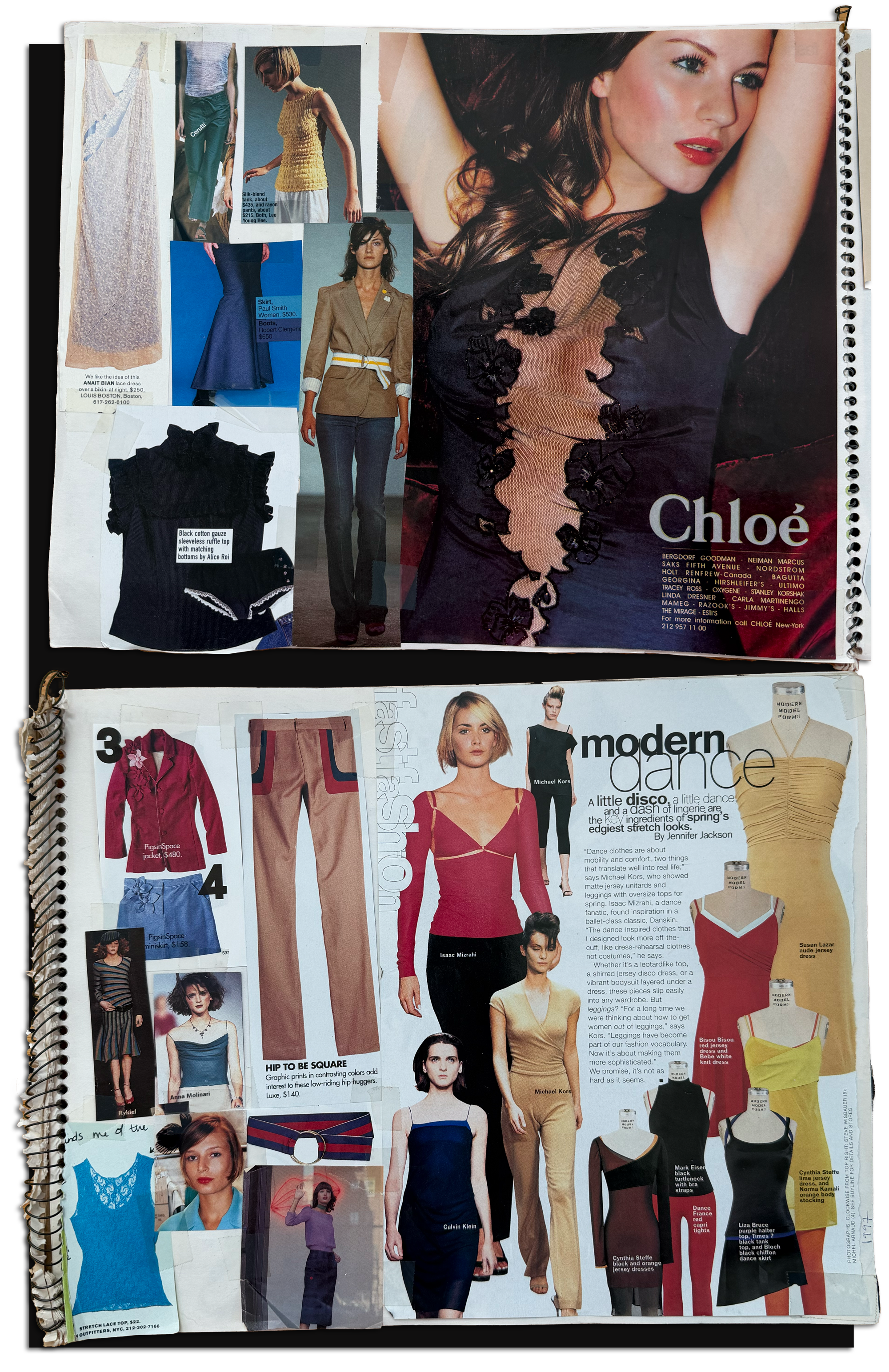 At the same time, I curated a fantasy closet of sorts, taping magazine tears into spiral notebooks. I maintained these proto-Pinterest “fashion journals” for ~a decade. A couple such pages are below, including baby Gisele in an ad for Stella McCartney’s first Chloé collection in 1998. I never expected to own any of the things in these magazines. The pleasure was in the wanting, and in cribbing styling principles that helped steer my thrifting. Long before “dupe” culture, I got good at ferreting out runway doppelgangers in the aisles of Salvation Army.