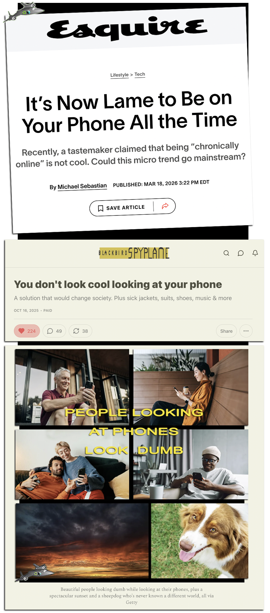 We’re in total agreement here at the Plane, to the extent that, months ago, we published a smash-hit sletter about how “You don’t look cool looking at your phone.”