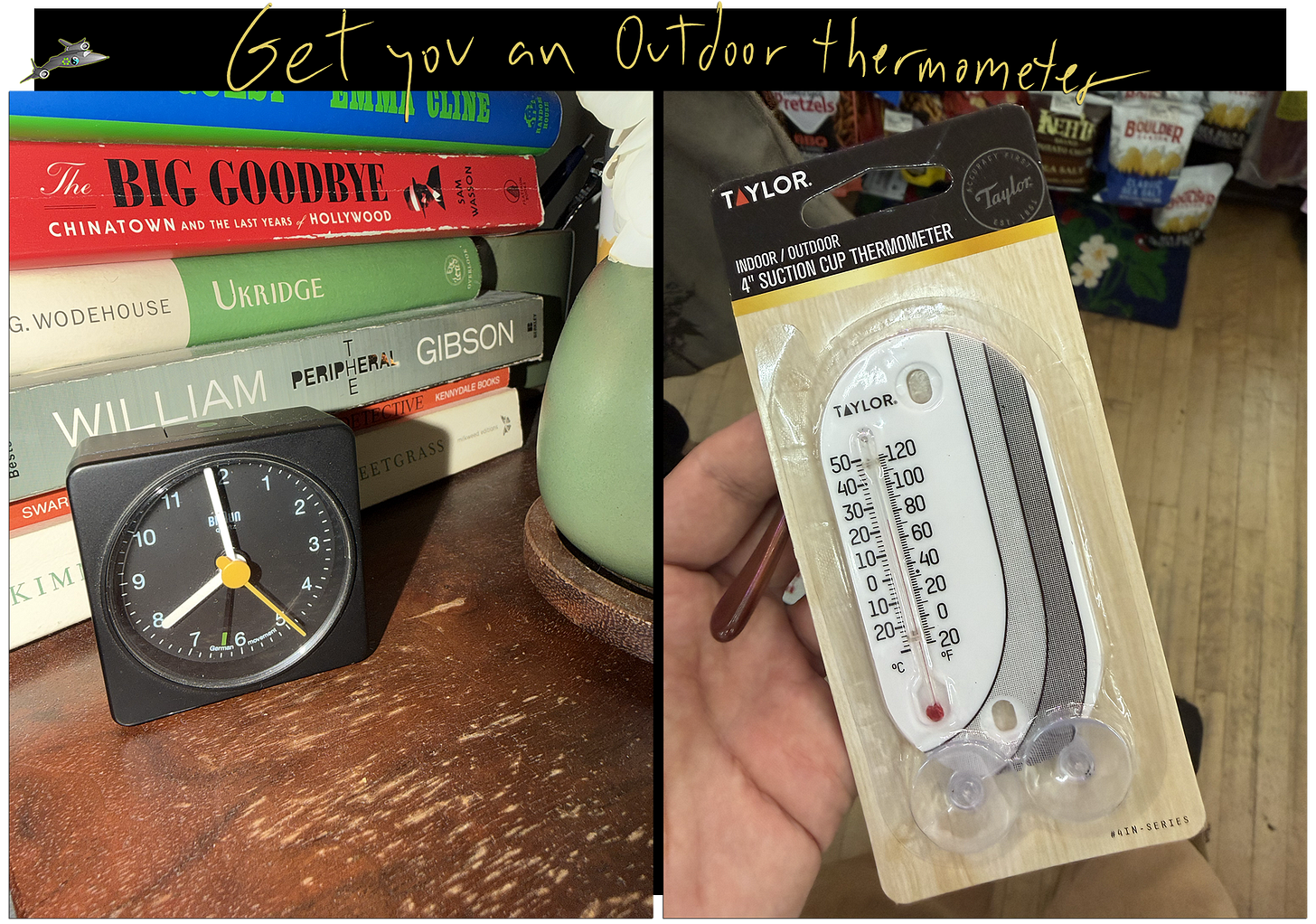We walked over to our great neighborhood hardware store, where they had a bunch of different thermometers for sale. We chose the smallest, simplest option, above right, which you just pop on to a window in a place that doesn’t ever get full sun. It cost us $2.79, it’s aesthetically inoffensive, and it has already increased our daily happiness by ~33.3%.