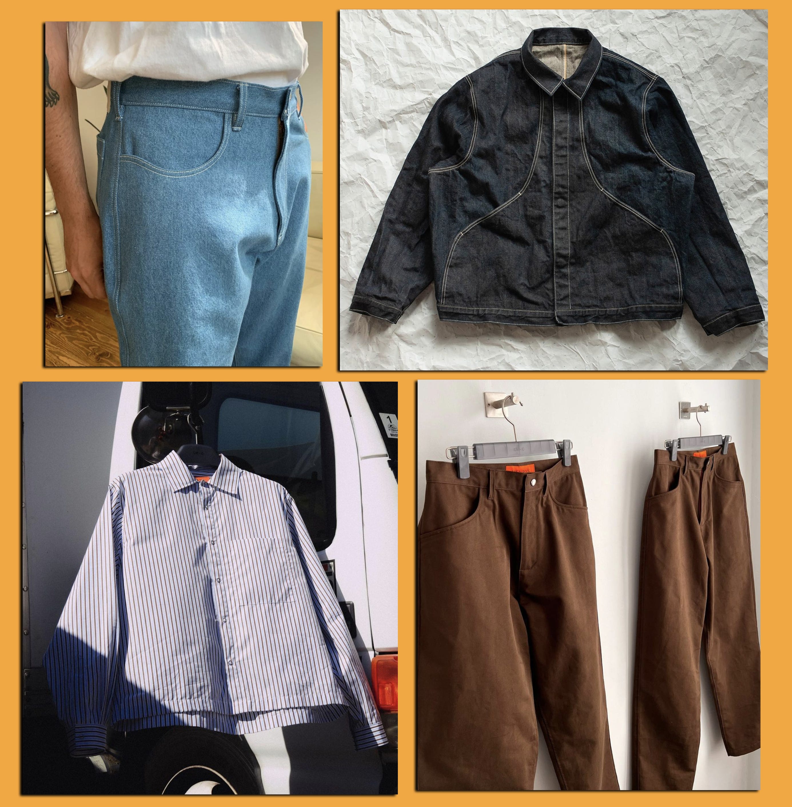 “As far as color, I found that emerald-green denim (above) and I was like, How can I use this? I decided the green would look good as something with more stitching, to break up the color, so that’s why I went with a double-knee jean, and the Swoop jacket (above top left and below top right), too. I didn’t know what the green would pair well with, but I put a swatch of the shirting on top (above center) and said, ‘That looks incredible.’ When I saw the finished pieces as a full unit I didn’t actually love how it looked together — there’s more blue in the shirt than white, so it had a bit of a weird tonal clash with the green. I added the navy pants to bring in some neutrality, and it all worked out.”