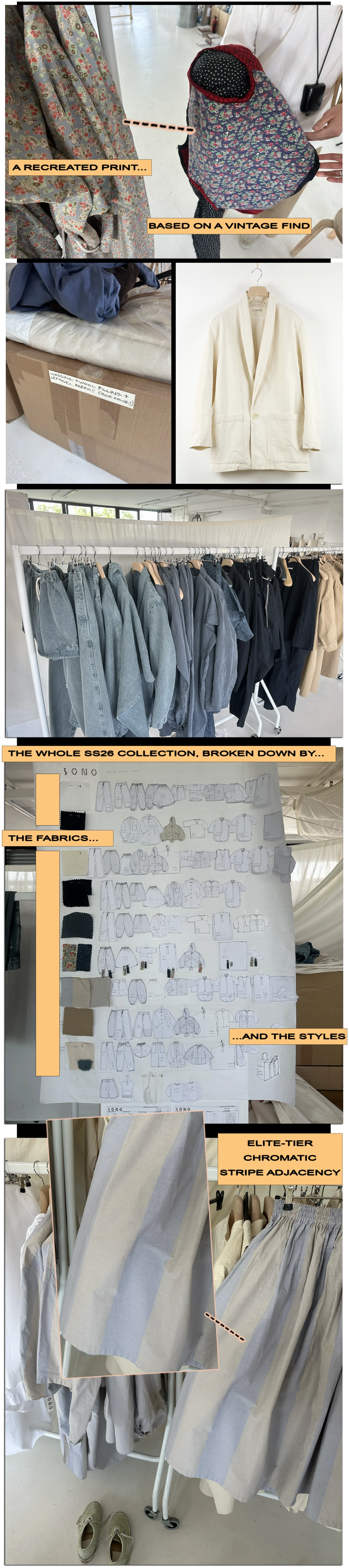 As you can see on the season breakdown chart above, Sono’s approach is to execute some couple-dozen styles across different fabrics. Of the SS26 samples they were shooting ahead of their Paris showroom, we were struck by several clothes cut from a floral-print organic cotton, topmost above. Simon showed us the reference piece for this cloth: a jacket from the Caucuses Mountains they’d bought from a vintage vendor in Spitalfields Market. They’d scanned the source print in black and white, asked a friend to color it using watercolors, and turned that into a new fabric (the pattern is printed, and visible on both sides).
