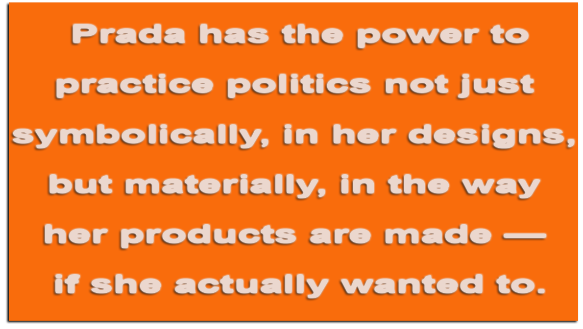 If you want concrete proof that Prada has long since abandoned the collectivist principles of her twenties, and that her politics are primarily aesthetic in nature, simply consider the fact that she went on to become a factory owner. And not one factory, but 26 of them.