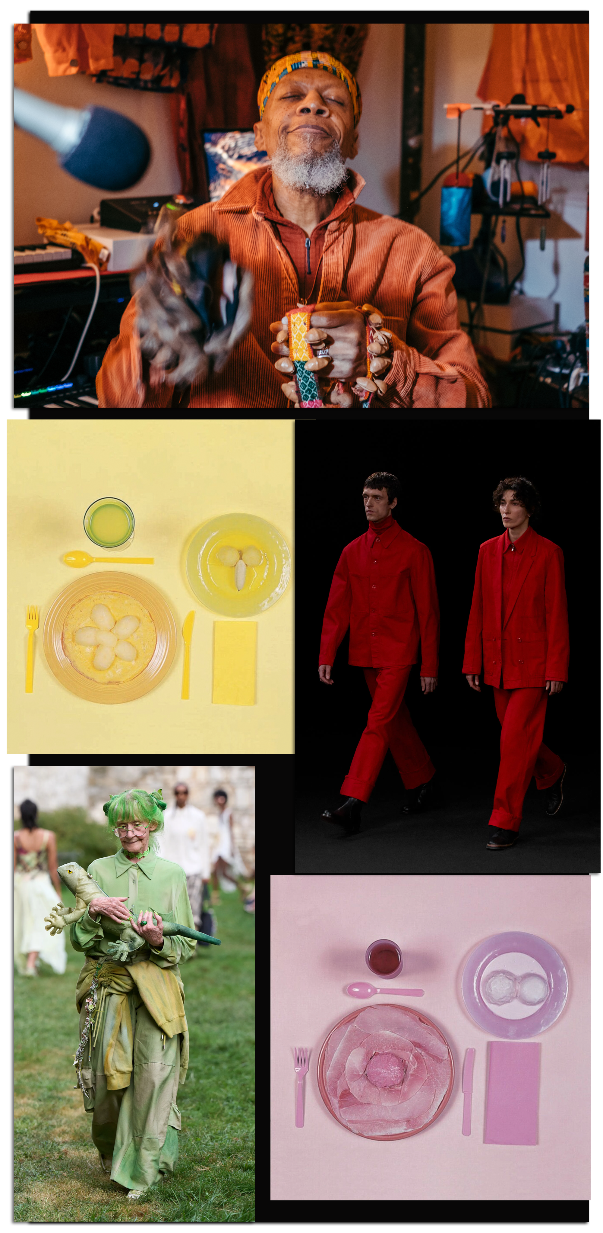 Or take Elizabeth “Sweetheart” Eaton Rosenthal, below bottom left, pictured walking in the Collina Strada SS25 show. She’s a former textile designer who went full green gang in 2000, after realizing the color just makes her feel happy.