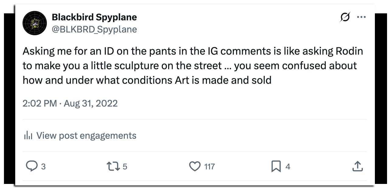 Blackbird Spyplane exists thanks to our readers. We don’t run any ads, we don’t use affiliate links on new clothes, we don’t do any spon. You’re the only people we owe anything, so we keep some of our best material for our Classified Tier Subscribers.
