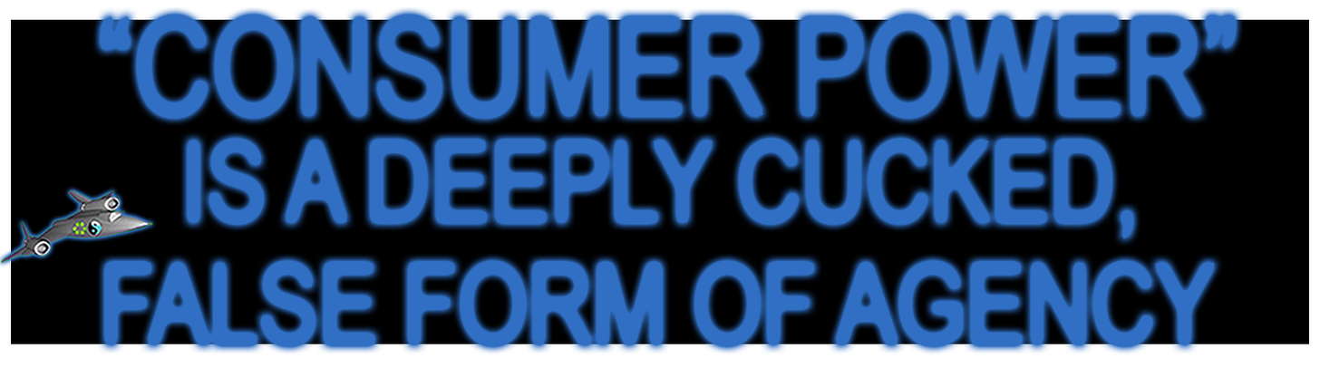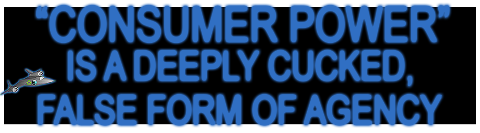 I get it. Even the best of us can feel powerless to effect any change upon the world except through displays of our “consumer power.” But that is, of course, a deeply cucked, false kind of power. Fight the freak wave. Practice kindness and consideration. Saintliness is next to saucefulness. Put your anger and your energy where it actually matters.