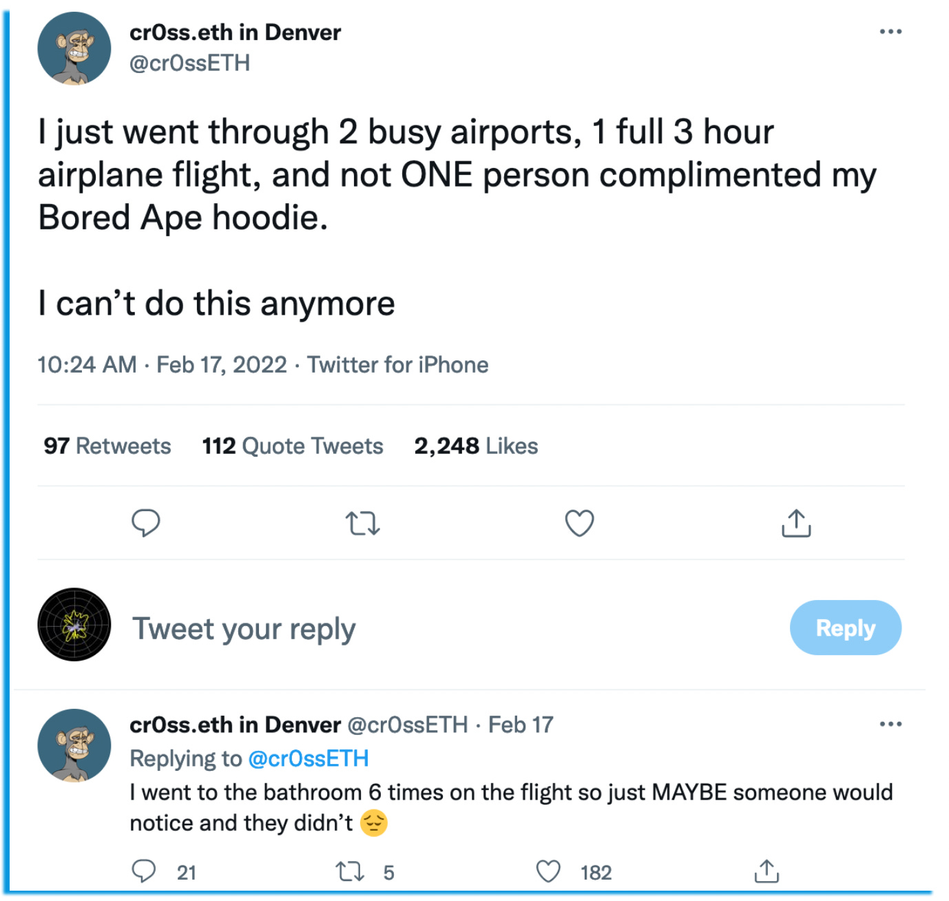 This affinity was made explicit in a very funny tweet from last month, where a dude posted about feeling despondent ‘cause he wore a garment festooned with a B*red Ape graphic in public and, instead of impressing anyone, it created an IMPERMEABLE DORK FORCEFIELD around him that we have to assume made everyone who crossed his path that day 100% less horny: