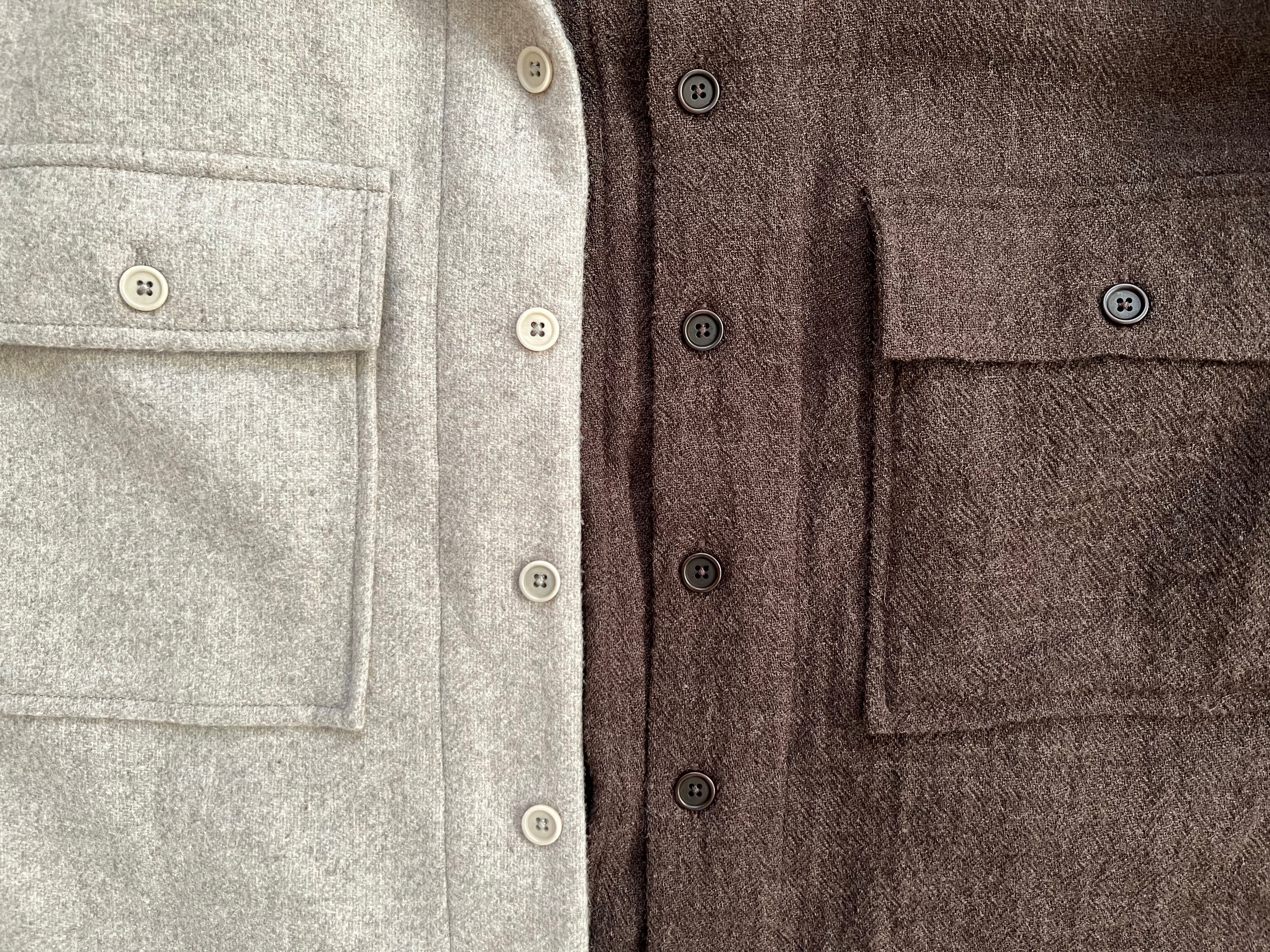 D. On my “STEVE REICH INCREMENTAL-VARIATION” modularity s**t, I decided to layer the brown wool-gauze Kinori shirt with the exact same style of Kinori shirt, except cut from a heavier grey-beige wool-cashmere blend. On a warmer day this s**t will remain on STAND BY.