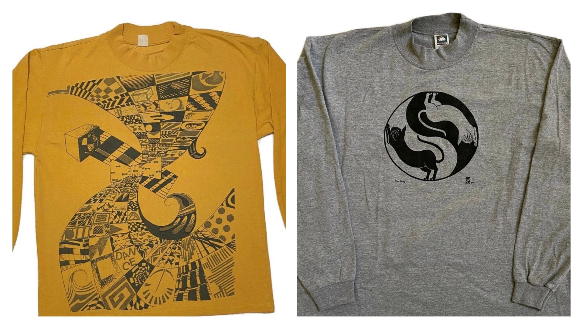 Trippy KIND-VIBED MOCKNECKS ?? Spyplane catnip. The Escher-esque joint above left is asking $50 here [SOLD!]; the CAT YIN-YANG joint is asking $23, here.