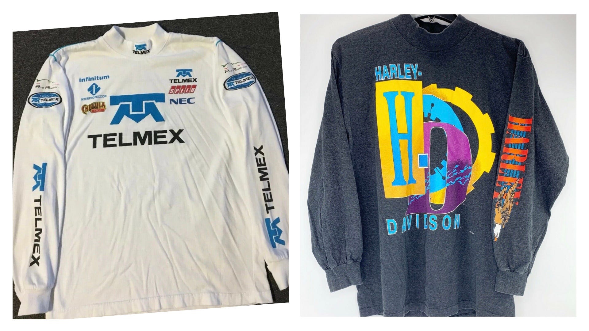 Getting more maximalist: After we talked to GQ’s Sam Hine about vintage racing jawns the other day we came away with a “NEED 4 SPEED.” The Telmex racing longsleeve above left, $38, [SOLD!] has an embroidered collar & sick screenprinted logos (including one for CHOLULA tha HOT-SAUCE GODS!!) and the $45 Harley longsleeve above right has appealing high-school engineering-textbook-cover-art vibes… [SOLD!]