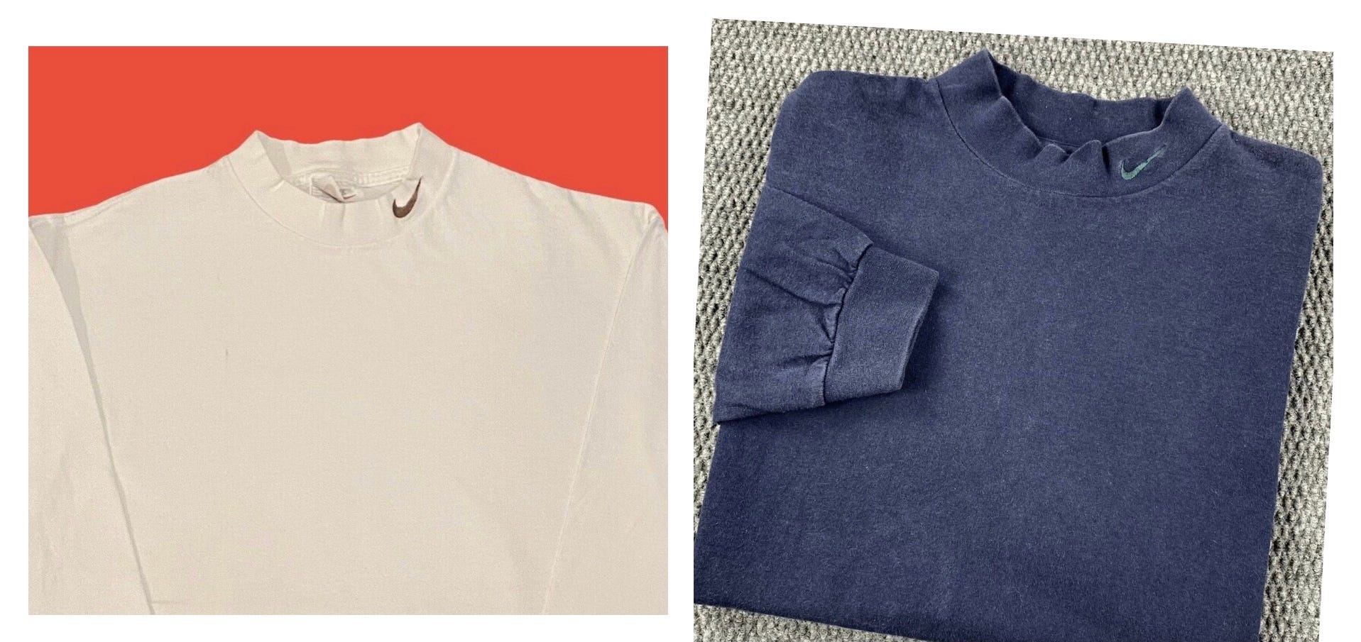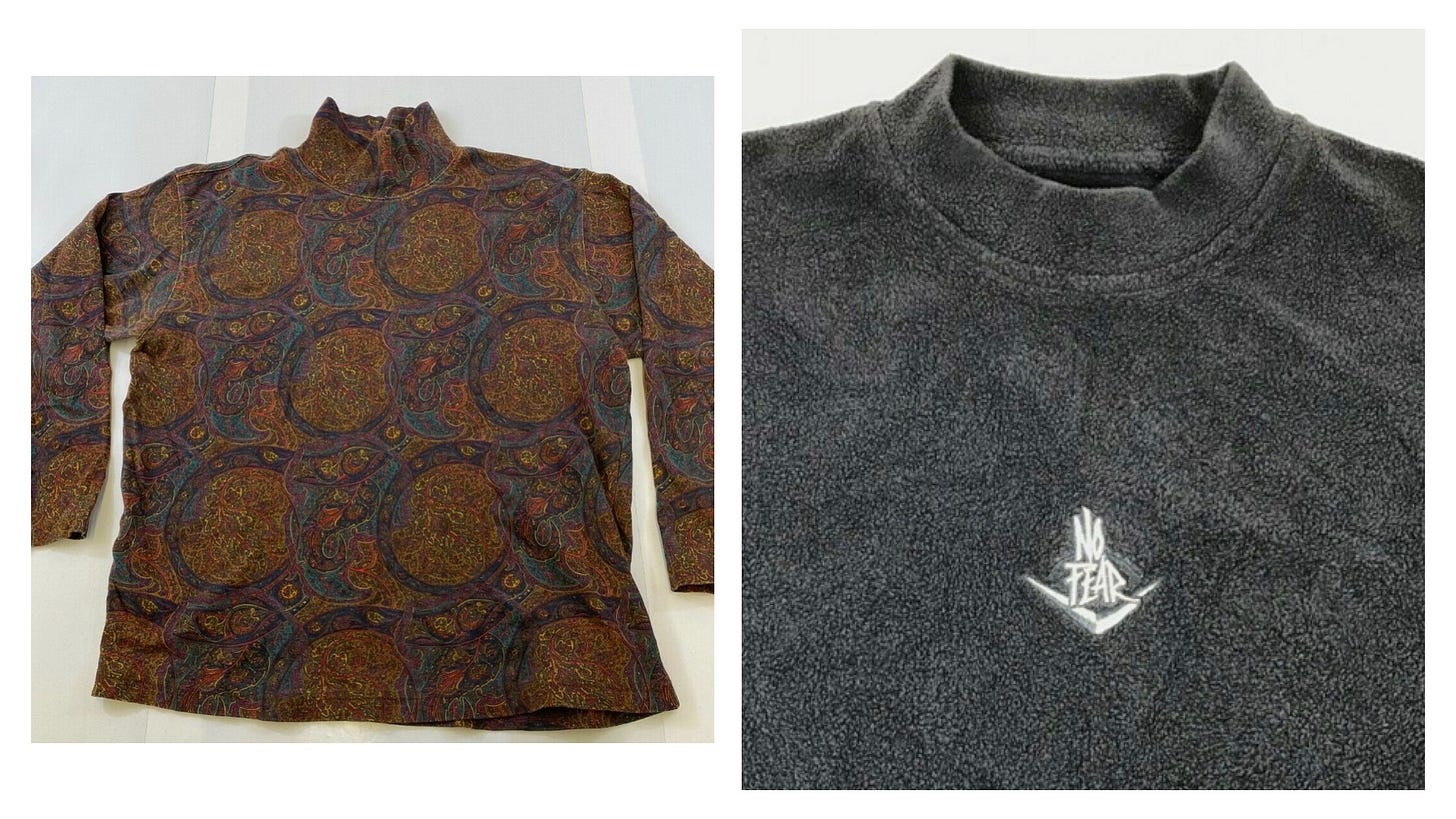 Elite resellers know the vibes… NYC’s Fantasy Explosion recently posted a SHINING FLEET of deadstock 1990 Champion mockneck sweatshirts (with side pockets!) in 5 different colors. Blackbird Spyfriend Charlie “Cherub” Franco DM’d us a FIRE souvenir WWDC2000 Apple mockneck in black size large, below left, from IG vintage account @knownbadboy (we slept and it is no longer available, damn), and then we saw a BOLD Land’s End mockneck at Space Camp, below right …
