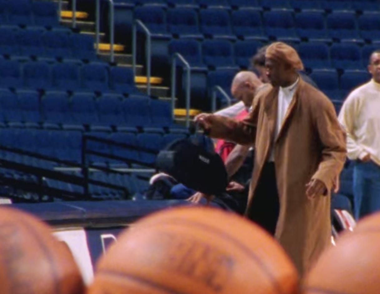 3. And of course there’s Michael Jordan in 2020’s The Last Dance. The HARDEST and most-slept-on fit of the series, from November 1997, was visible for just a few seconds: Bulls warmup pants, voluminous tan topcoat + beret and — O yes! — a white mockneck … WOW: