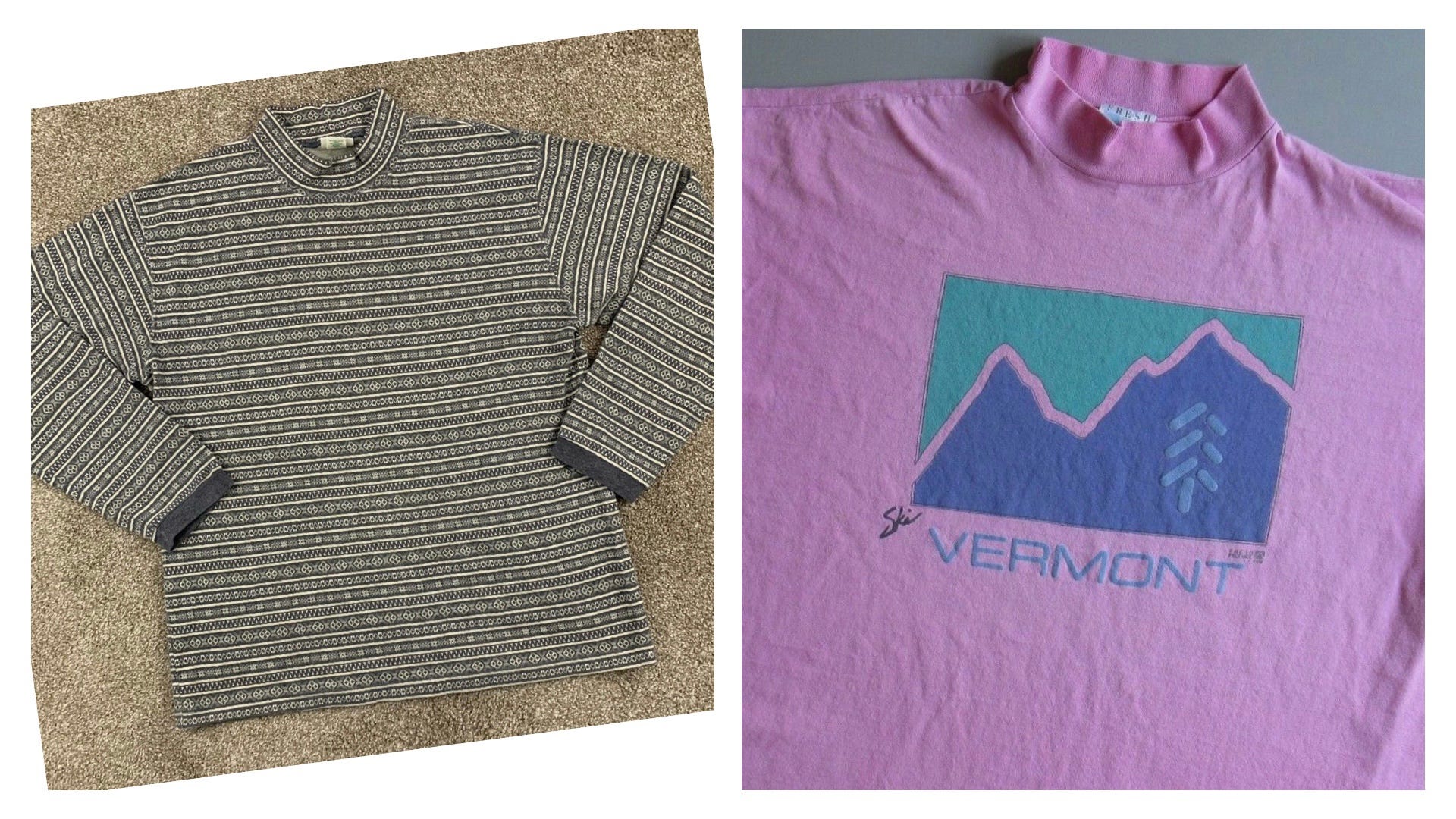 The knit “Aztec” Made in U.S.A. L.L. Bean TREASURE above left is asking $40, [SOLD!] and we would rock the f**k out of the pink “Ski Vermont” tee above right, asking $75 here.
