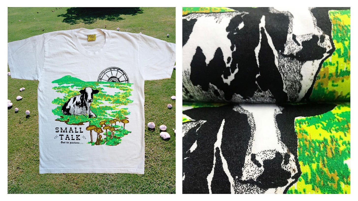 This Thursday our Cla$$ified Subscribers get EXCLUSIVE EARLY ACCESS to Small Talk’s brand-new limited-edition t-shirt — a 5-color cow-shroom beauty screenprinted on 100% recycled cotton blanks …