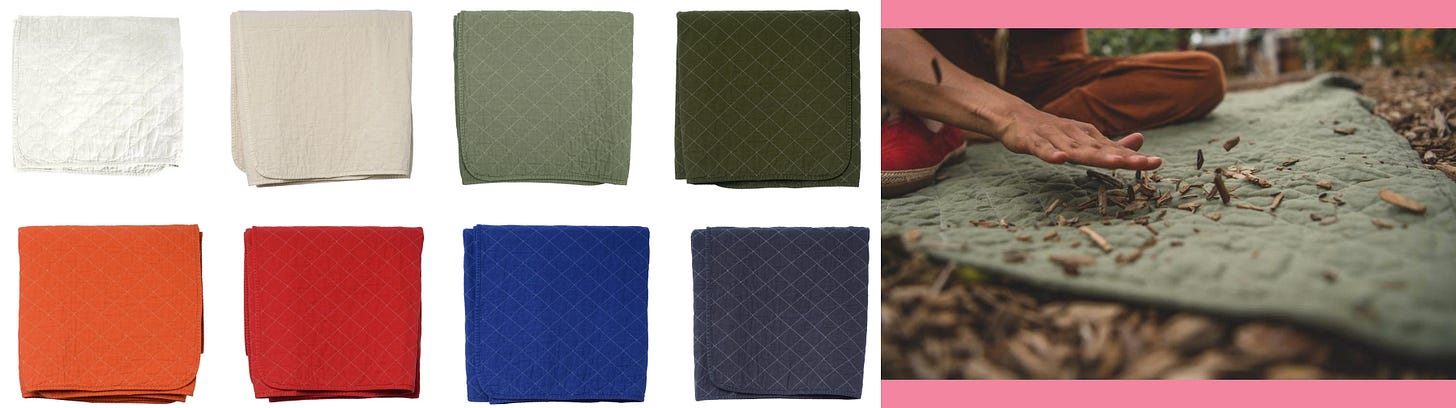 -As far as a blanket, we use a soft lightweight canvas tarp I got years ago, of the kind that you can find at a hardware / paint store… if U want something slightly cushier, check out the ill multicolored quilted joints pictured above from Utility Canvas (they make napkins, too).
