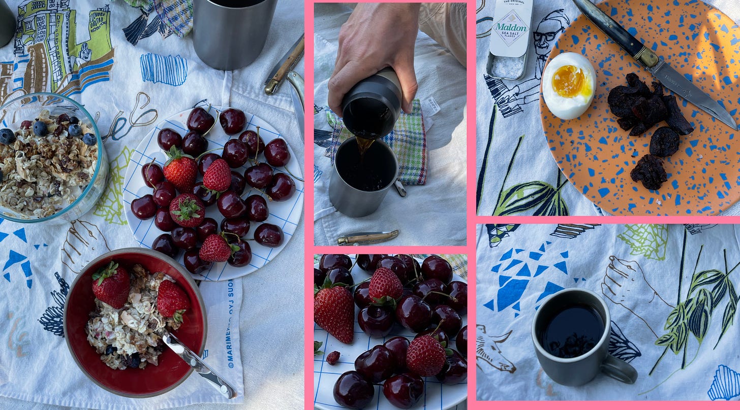 🌱🔬 A blanket, reusable dishes & utensils, cloth napkins, a SWAGGY vintage folding knife, and — this is non-negotiable for a breakfast hike — a thermos to pour tea or coffee into actual ceramic mugs! Why is this last part so crucial? Because yr coffee will taste better, and because the simple frisson of sitting outside on a blanket enjoying coffee not from a paper cup or travel sipper but from a cool ceramic mug fresh out the cupboard is going to delight yr brain, heightening the pleasurable al fresco juxtaposition.