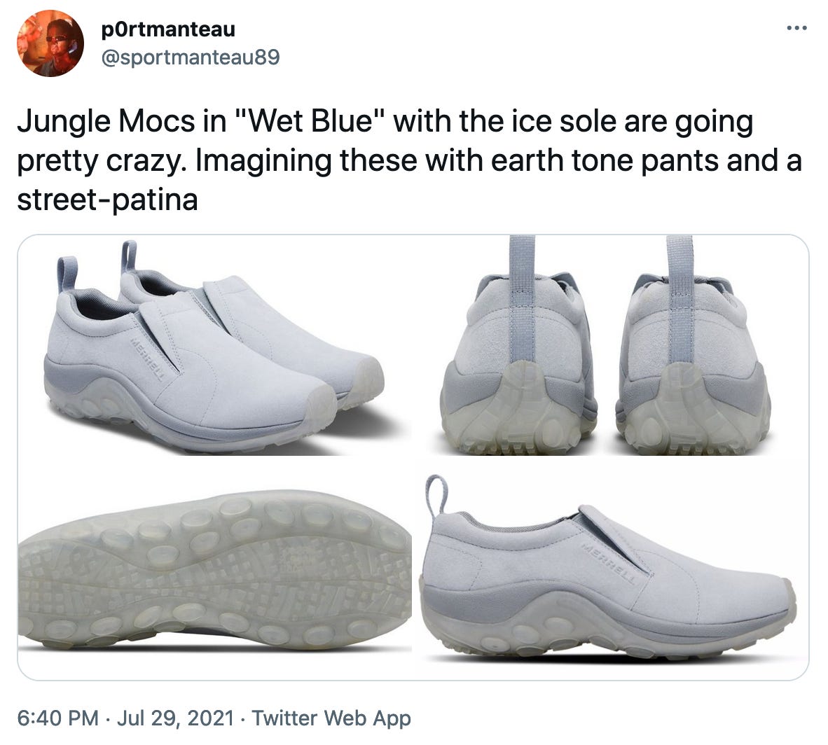 Also, we’re feeling these “wet blue” unisex Merrell Jungle Mocs with the frosty bulbous outsole that GORP-fluent SpyFriend Wes A. posted on Twitter the other day: