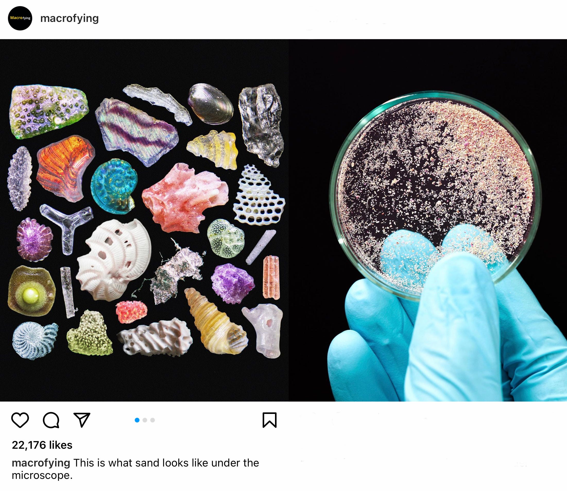 Erin just came across this IG post, where homie scrutinized some beach sand (above right) at 5x magnification and discovered that the seemingly boring-a** grains actually contained a hidden galaxy of INTRICATE WONDERS (above left) — a beautiful illustration of how literally microscopic encounters with the natural world can actually open VAST UNIVERSES of discovery !!