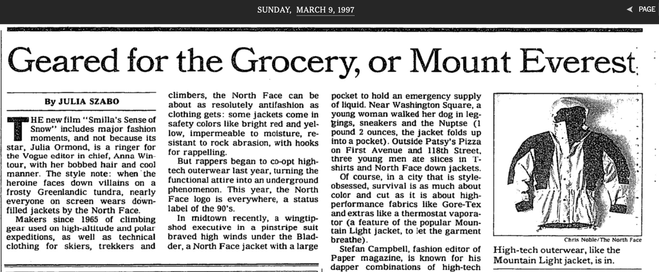 The thing about GORP is that it’s been “co-opted” — and its meaning has been wildly elastic — for decades. Young swaggy kids who rocked North Face Nuptses on NYC streets during the first ‘90s-era GORPWAVE were technically “posers” (in the sense that they weren’t swatting mosquitos and purifying creek water in the Sierra Nevada), as were gorped-out yuppies wearing Patagonia DAS parkas to go shopping in Darien, CT at the same time… Which is to say that “co-optation” can have all kinds of unpredictable effects when it comes to jawns — some wack, some fire.