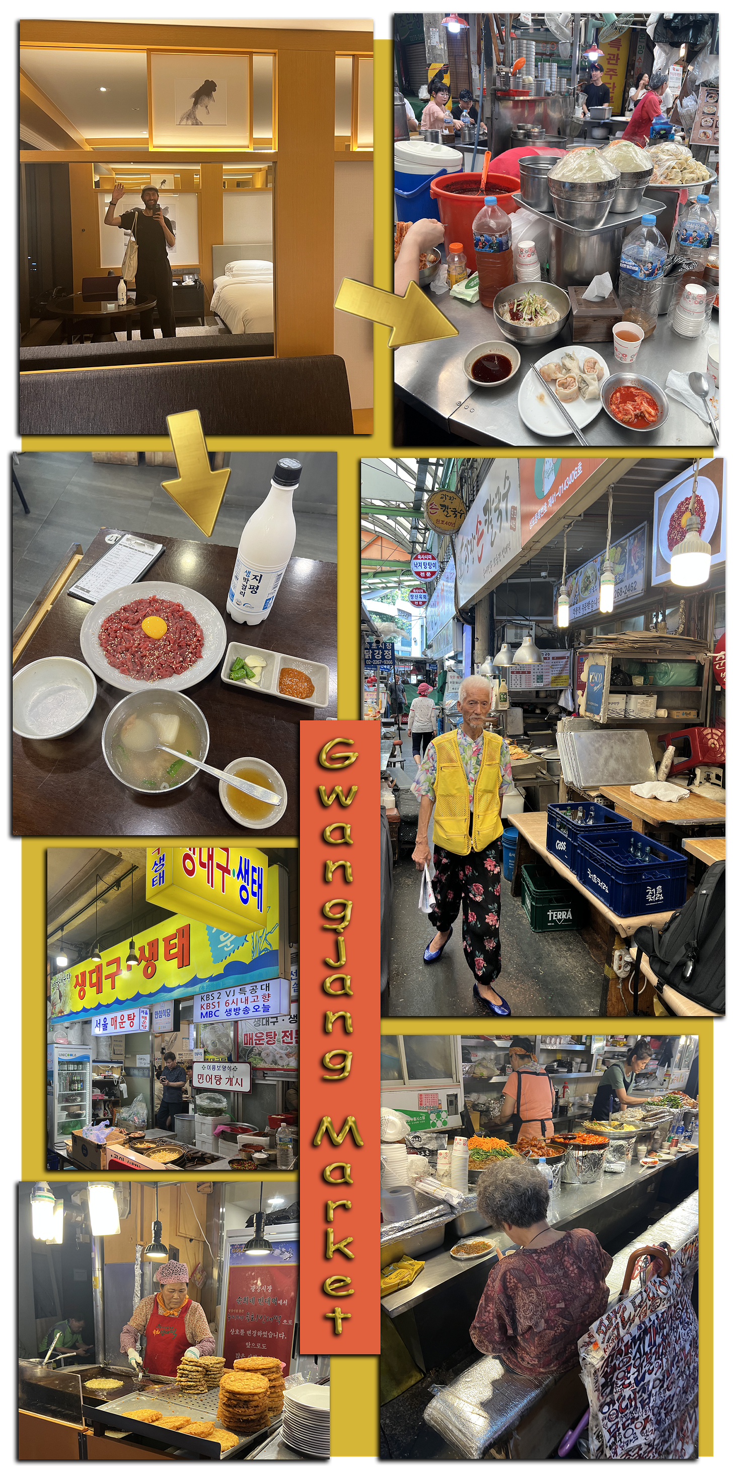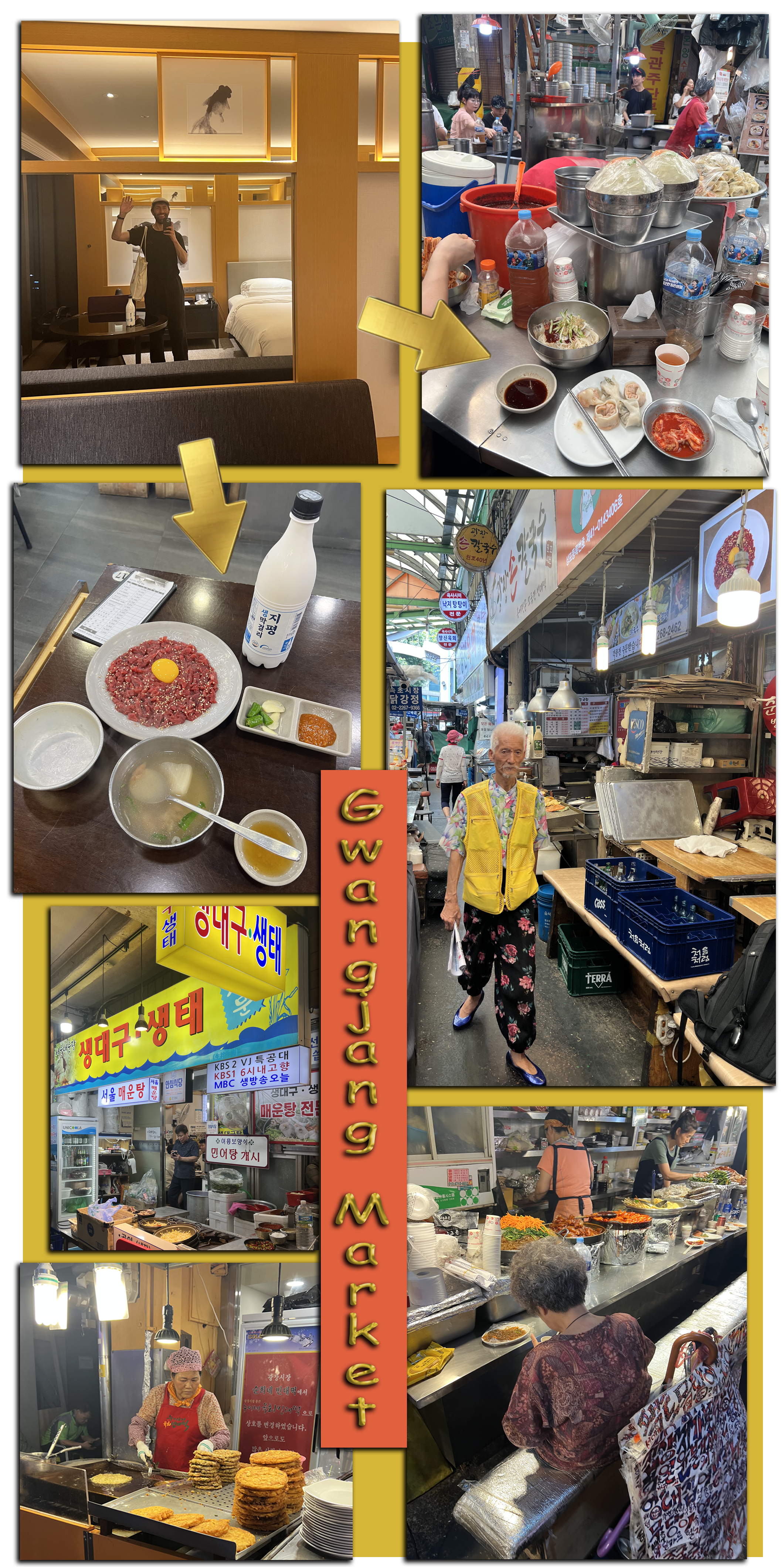 This is Seoul’s cacophonous enclosed street-food hub, open day and night. Also, as evidenced by the swaggy king pictured above right serving in the yellow vest, floral shirt & pants, and iridescent YURPLE (?!) flats, Gwangjang is a hot-spot for people-watching, too. My foolproof m.o. every time I went was simply to see where a bunch of people were eating / waiting to eat, grab a seat, point at whatever looked good and tell the chef, “kamsahamnida.”
