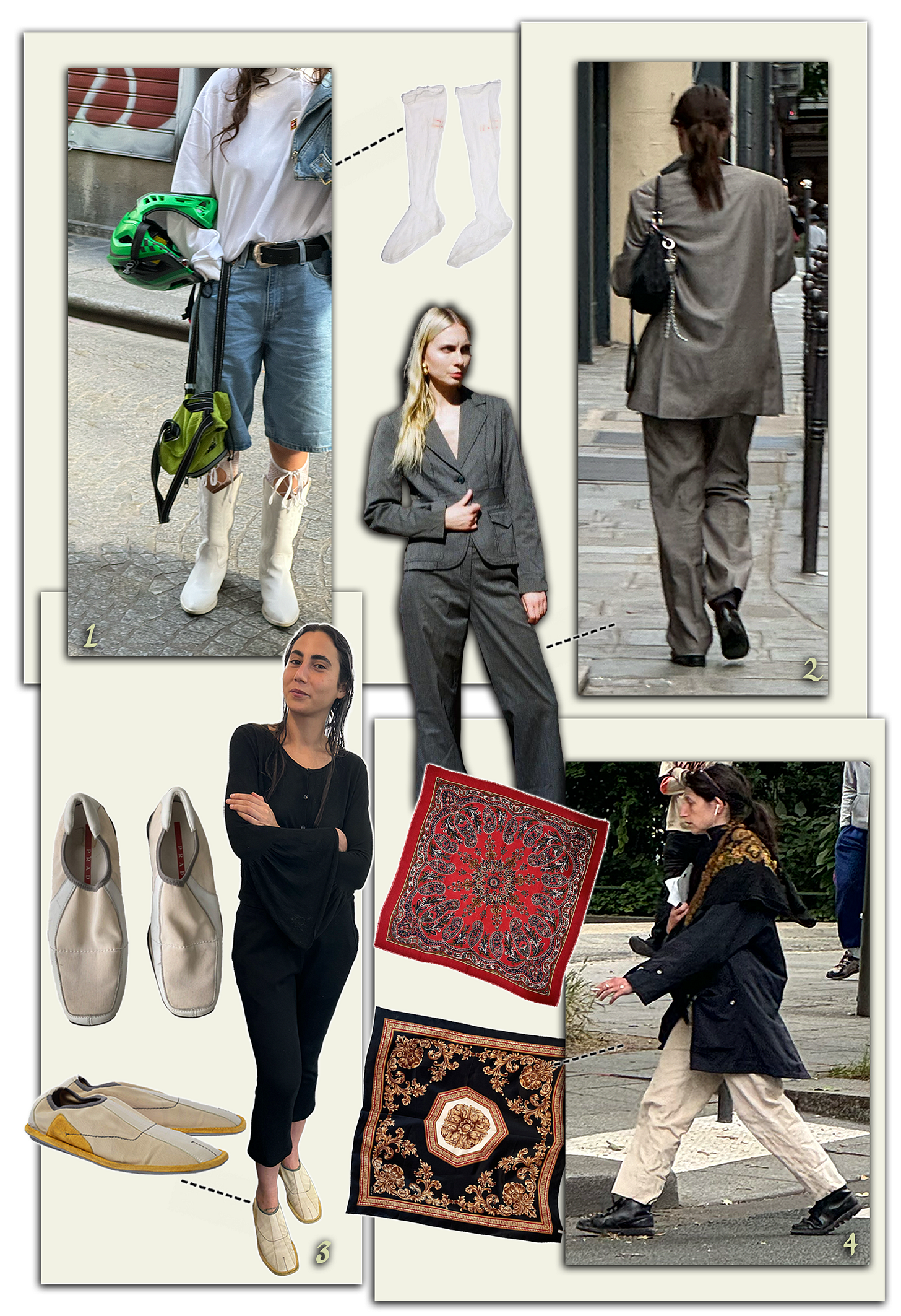 Paris street fashion confirms that ladies really do be wearing long baggy jorts with tall boots — a look I saluted in last summer’s Shorts Report. (I also saw jorts paired with tall slouchy socks and slim-soled sneakers or ballet flats — both cute). I loved my girl’s look (1 below) with her complicated corset socks, white boots, jorts, thick belt, Brat-green bag and arm looped through her motocross helmet to top it all off. For a similar sock, check out Yuhan Wang’s lace knee-highs.