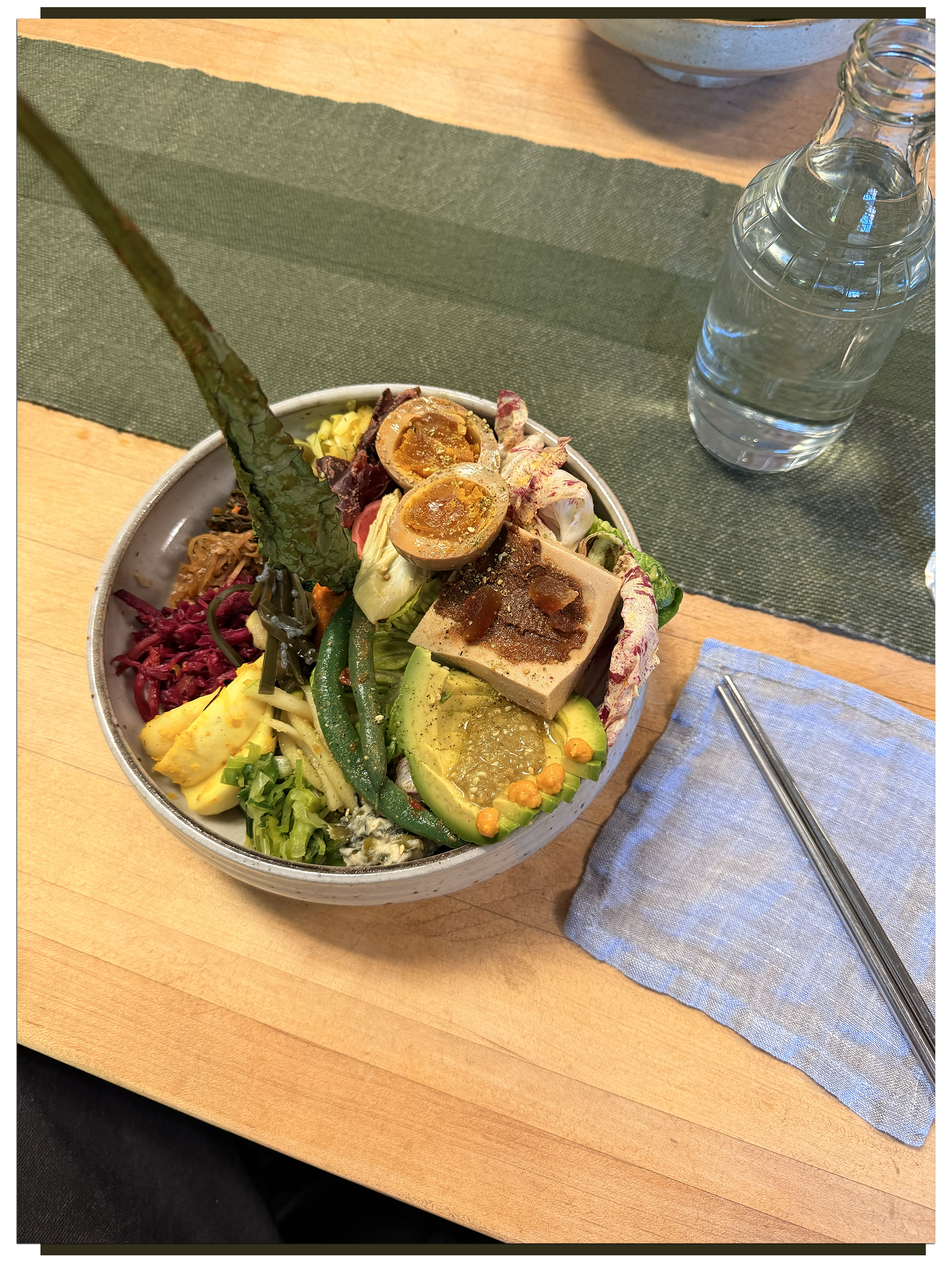 I know what you’re thinking: “Jonah, that is a spectacular assemblage of radicchio and baby romaine dressed with Meyer lemon kosho, butternut squash in kasu, sauerkraut, radish with parsley & juniper berries and brine kanten, turnip-green kimchi, apple with umezu, kombo and basil seeds with basil vinegar, green beans with jalapeno kasuzuke, koji leeks, nettles with jalapeno mirin, fennel with preserved lemon, kale with date and kimchi brine, leeks with miso tamari, tokyo turnip with lime pickle, fennel & beet kasuzuke, radish green and dulse gomashio, goma dofu, avocado with koji garlic and blood orange kosho, and a cured egg. Your Spycrobiome must be thriving and your skin must be radiant right now. Where’s this from??”