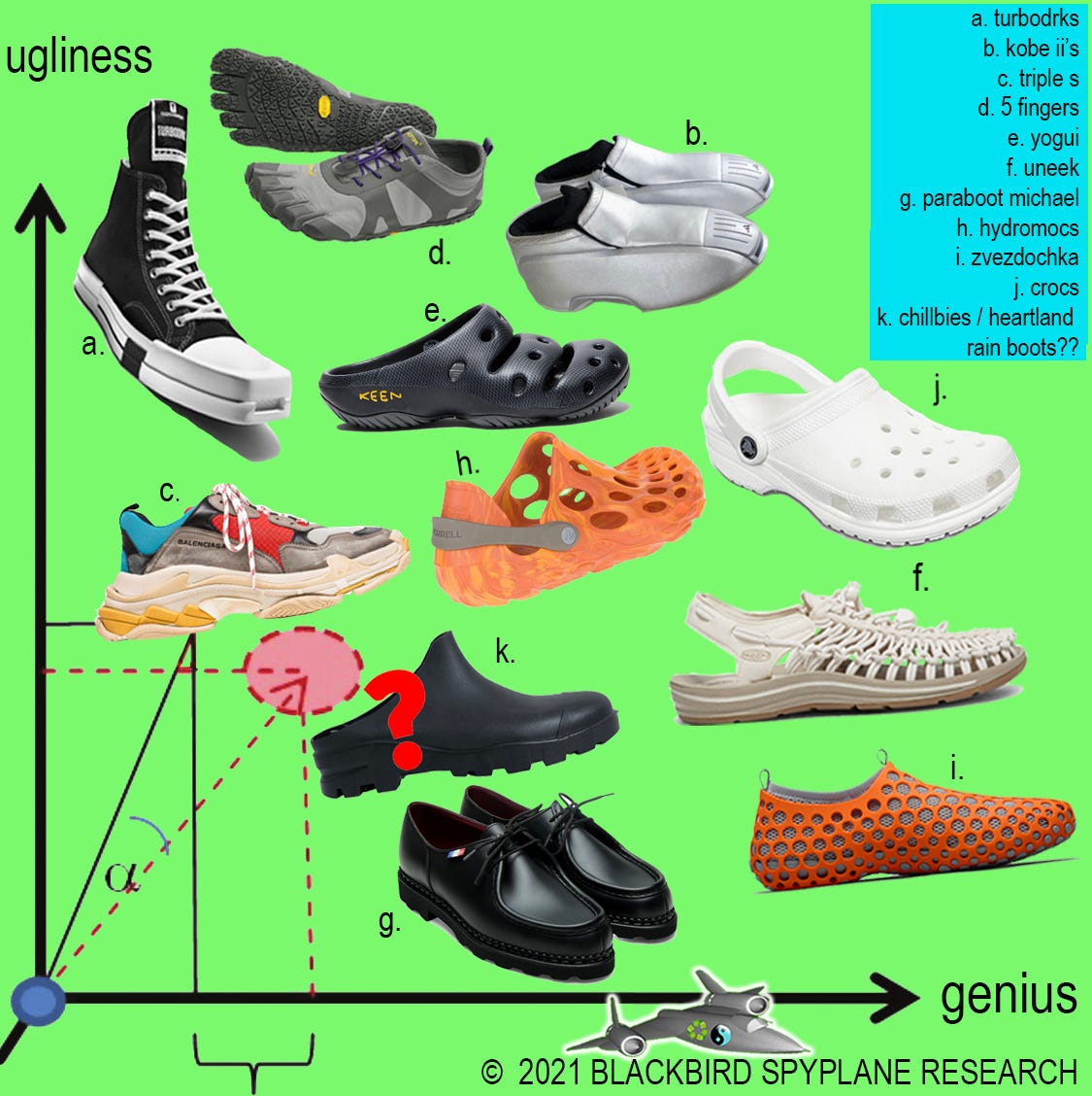 The ugly <~> genius footwear graph, pictured above, is provisional & up for constant debate, but as of right now, the new Rick Owens “Turbodrks” feel very ugly and not very genius. Interestingly, they are less ugly but less genius than the Vibram 5-Fingers, which in turn are much uglier than the Balenciaga Triple S’s, which are themselves not as ugly (and not as genius) as the Keen Yoguis. The Merrell Hydromoc is uglier than the Paraboot Michael but slightly more genius, and it’s not as ugly as its father, the Croc —but definitely not as genius. The Keen Uneek is basically equal in genius to the Croc, but a smidge less ugly. Time has been good to the Adidas Kobe II, which remains legendarily ugly but whose bizarre genius shines brighter today than ever.