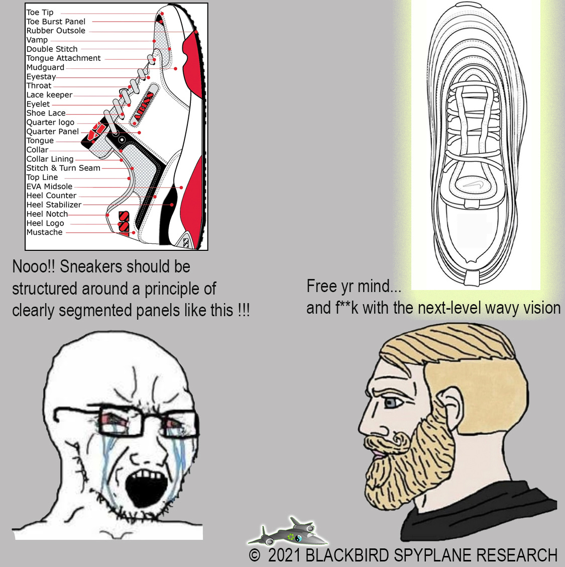 I touched on this dynamic in the newsletter a couple weeks back, re: the Air Max ‘97, when I was discussing sneakercraft with ex-Nike ACG designer Nathan VanHook. The ‘97 is a landmark of modern sneaker-genius, but truth be told, the first time I saw it, its weird concentric-circle architecture and maximalist-minimalist reflective monotone colorway turned my stomach… “Nooo!!! Cool sneakers don’t look like that!” I whined on some soyjak-meme s**t, a frightened prisoner of jawn-virginal small-mindedness.