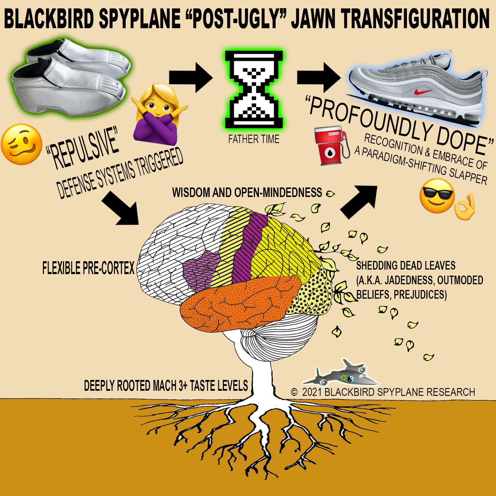 In the life of the wise SpyConnoisseur, though, this recoil can become a beacon — there are moments, like with Young Jonah and the Air Max ‘97, when a jawn reorganizes / bends / breaks “the rules” in a way that feels destabilizingly ugly at first … then “ugly” transforms into “post-ugly” … and profound dopeness emerges from the wreckage of our mind prisons…
