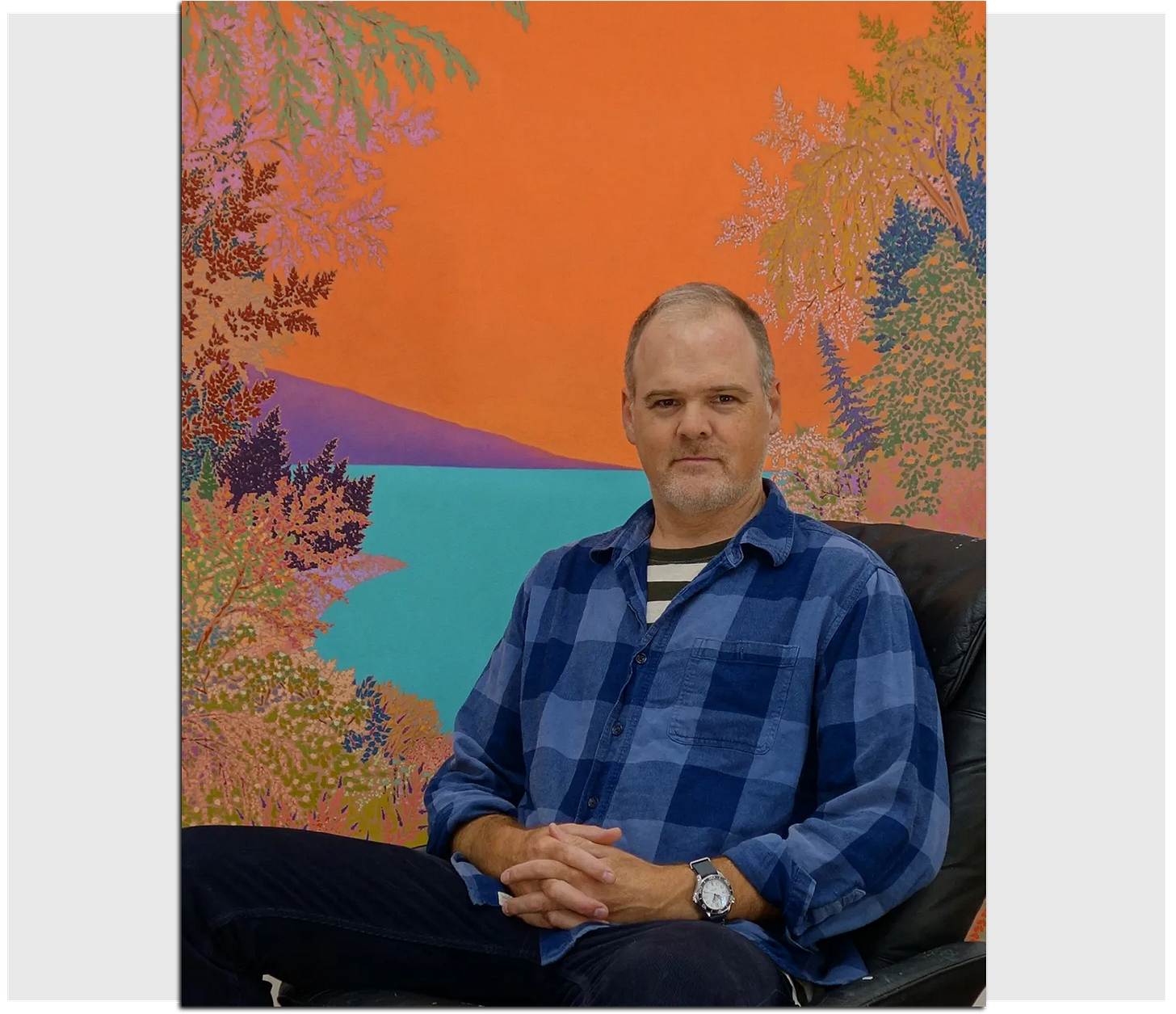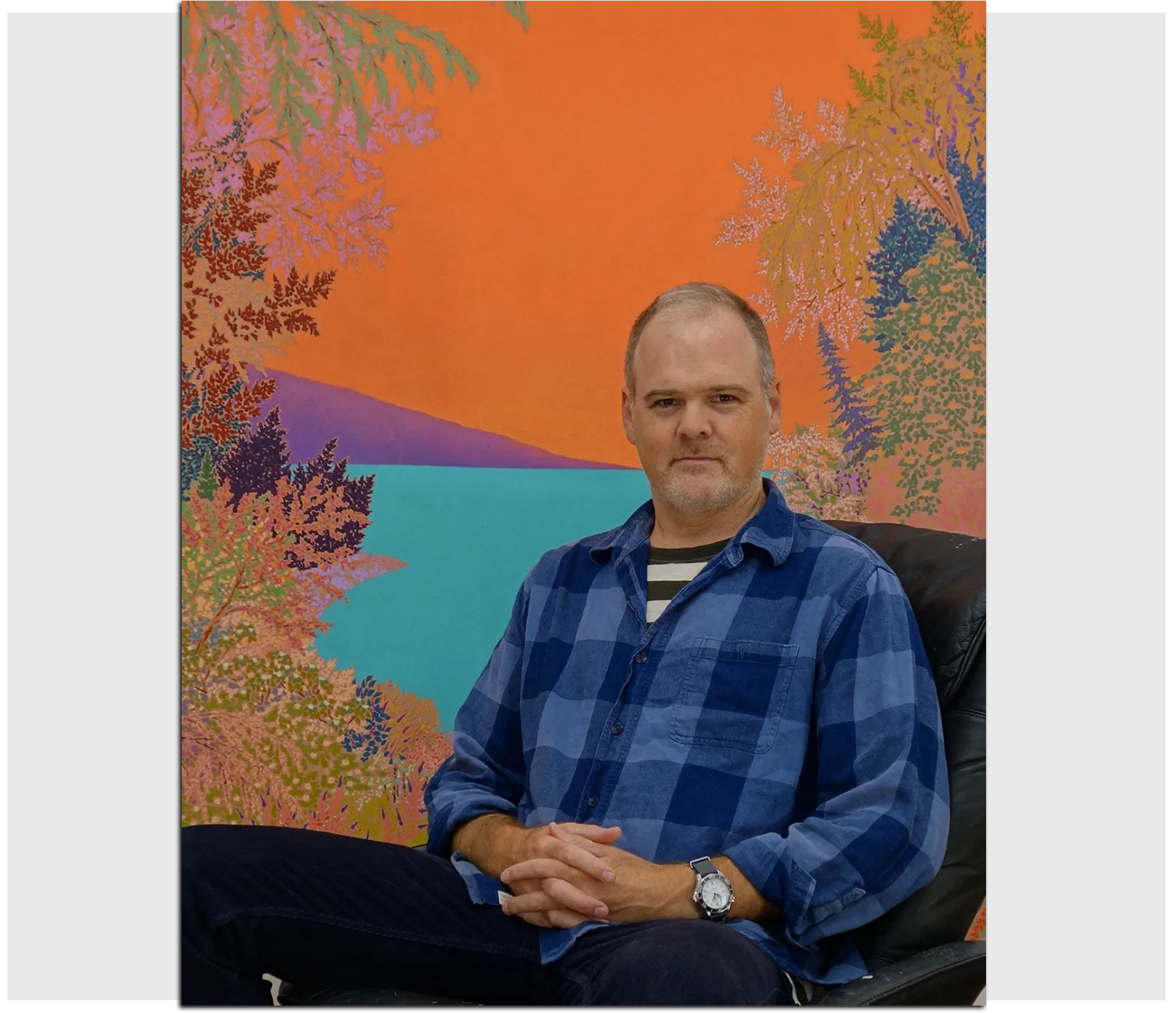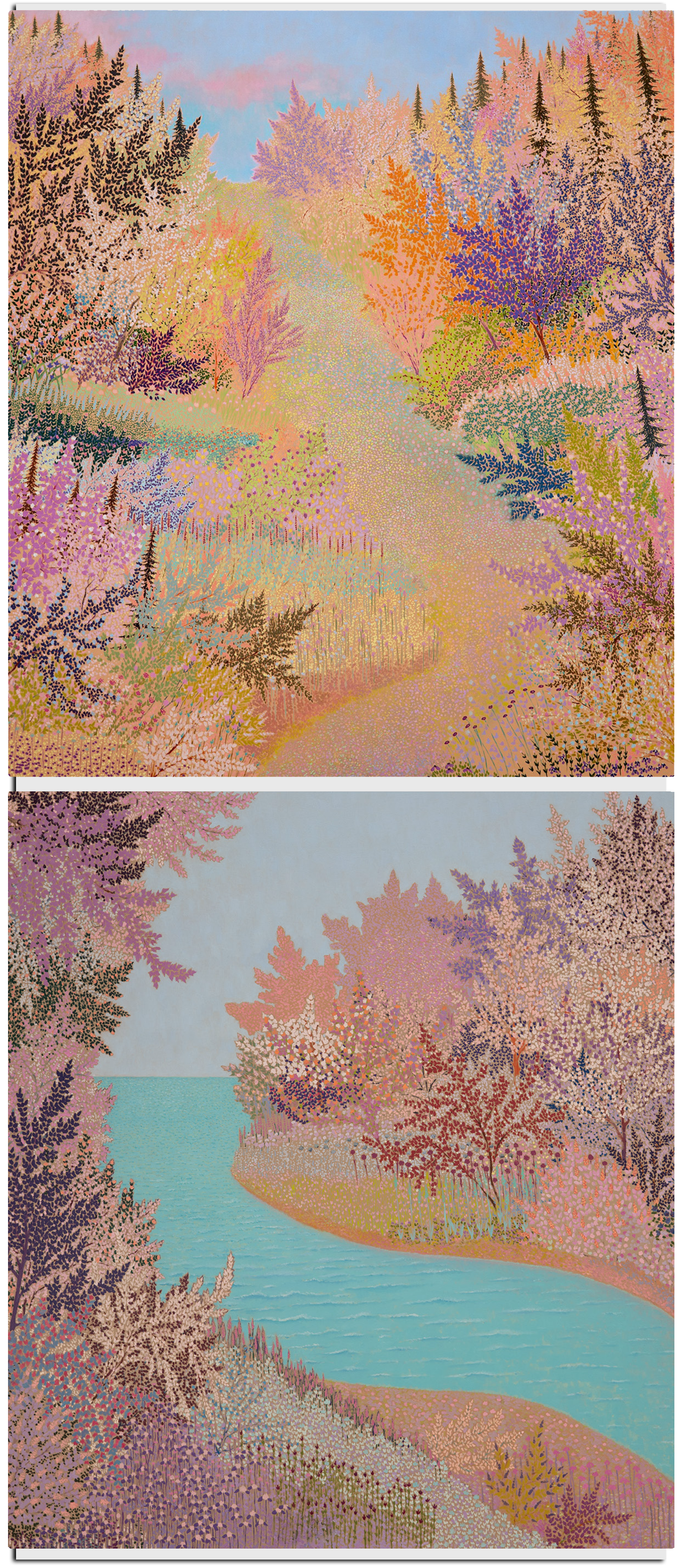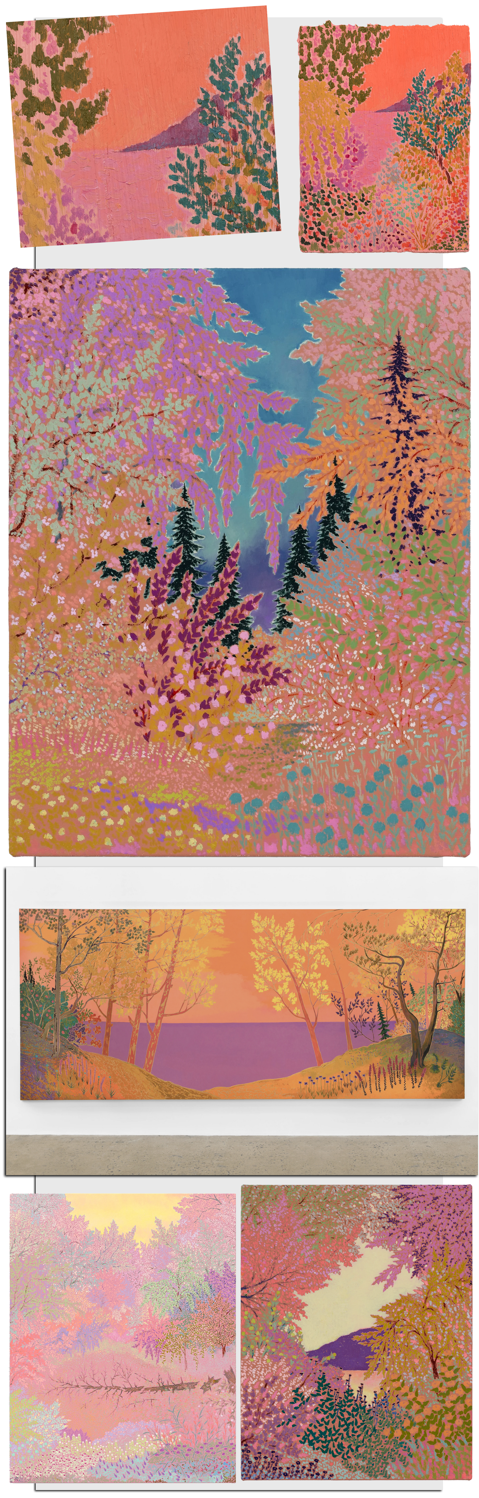 McAllister’s colors don’t make strict literal sense, either, but they are full of pleasure, too. He might frame his clearing, impossibly, with blue leaves and creamsicle-orange flowers, throbbing under pink and yellow skies. He negotiates between Monet pastels and borderline-garish Miami Beach hues, rendering woodland scenes with tropical and almost chemical palettes. One of his gifts is that he never tips into grotesquerie or abject kitsch. “It’s about edging up to corniness — you get near Miami, but you stay in Provence,” he says. “I like artificial colors in a natural setting, because for me, it’s always about choosing the thing that extends itself beyond the ordinary. All this artificiality presents opulence, and then you can soften it all, so it’s soft and inviting and chaotic at the same time.