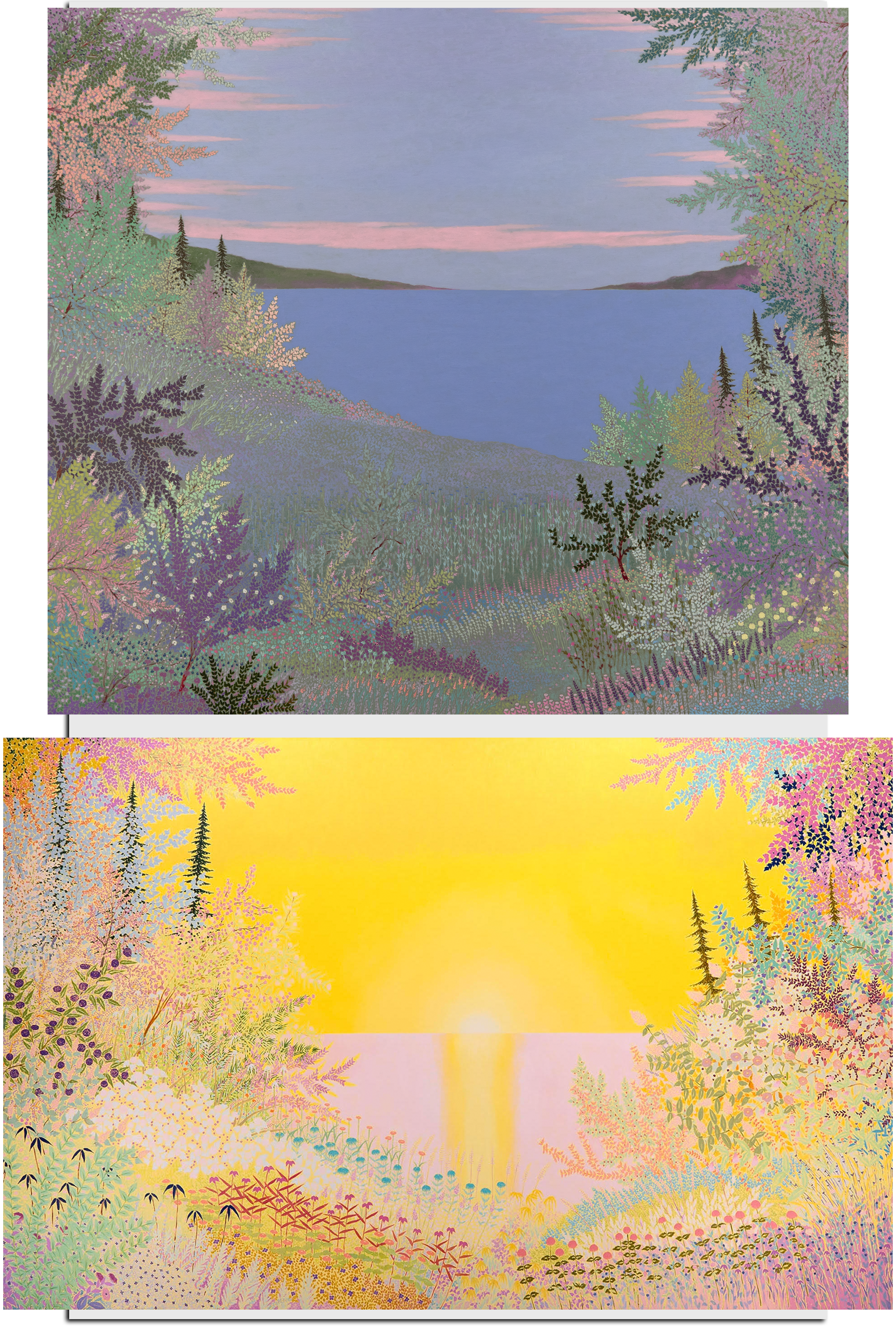 In much the same way that the places McAllister paints do not exist, neither do the plants. “A botanist would lose their mind looking at any of these paintings,” he says. “I’m making them up. I look for shape and texture, and balance those off each other. There’s a new painting” — ablaze rapt chorus beaming, pictured in-progress above and completed below — “with this strip of reflection on the water that, in person, you almost need sunglasses to look at it. And as the plants get close to the water, they’re like these little soft explosions. I’ll be having that thought while I’m painting them, and I’ll find myself making an audible little sound while I do, without realizing it. I’m going for this phenomenological feel, and so I’ll look for shapes that either contrast or go along with what’s there. The color has to perform that way, too. It’s all performative: The leaves and the flowers are a structure to perform upon. They’re the allowance for these colors and shapes to be there.”